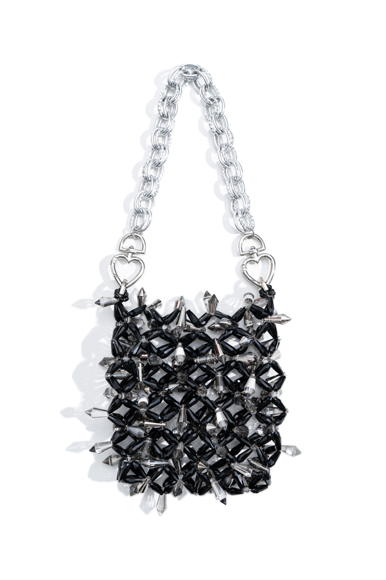 A handbag made by interlacing crystal beads. Model with one short handle with carabiners-hearts. Opaque pouch included. The height of the product is 12 cm, the length of the chain is 69 cm.