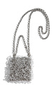 A handbag made by interlacing metal rings and decorated with transparent beads of irregular shape. Model with two chain straps with carabiners. The height of the product is 12 cm, the length of the handle is 12 cm, the length of the chain is 109 cm.