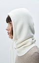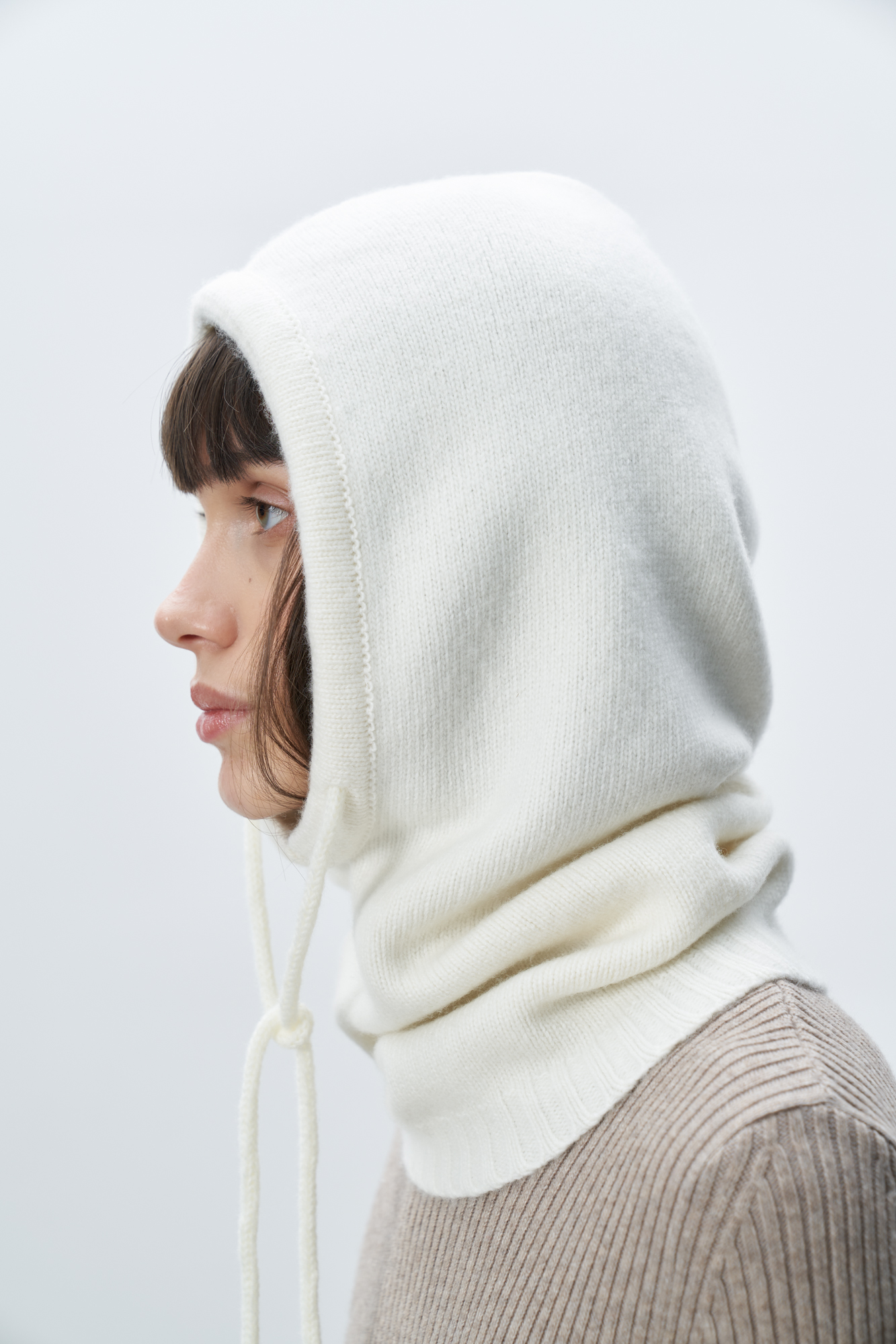 Knitted balaclava in a wool and cashmere blend with a drawstring and rounded edges.
