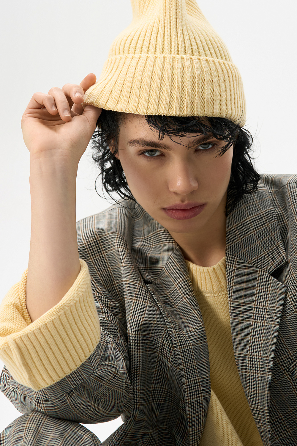 Knitted hat made of 100% cotton. Model with a high lapel.