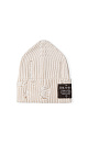 Knitted hat made of 100% cotton. The model is made with missing loops, imitating shingles. The product is decorated with a branded label on the lapel.