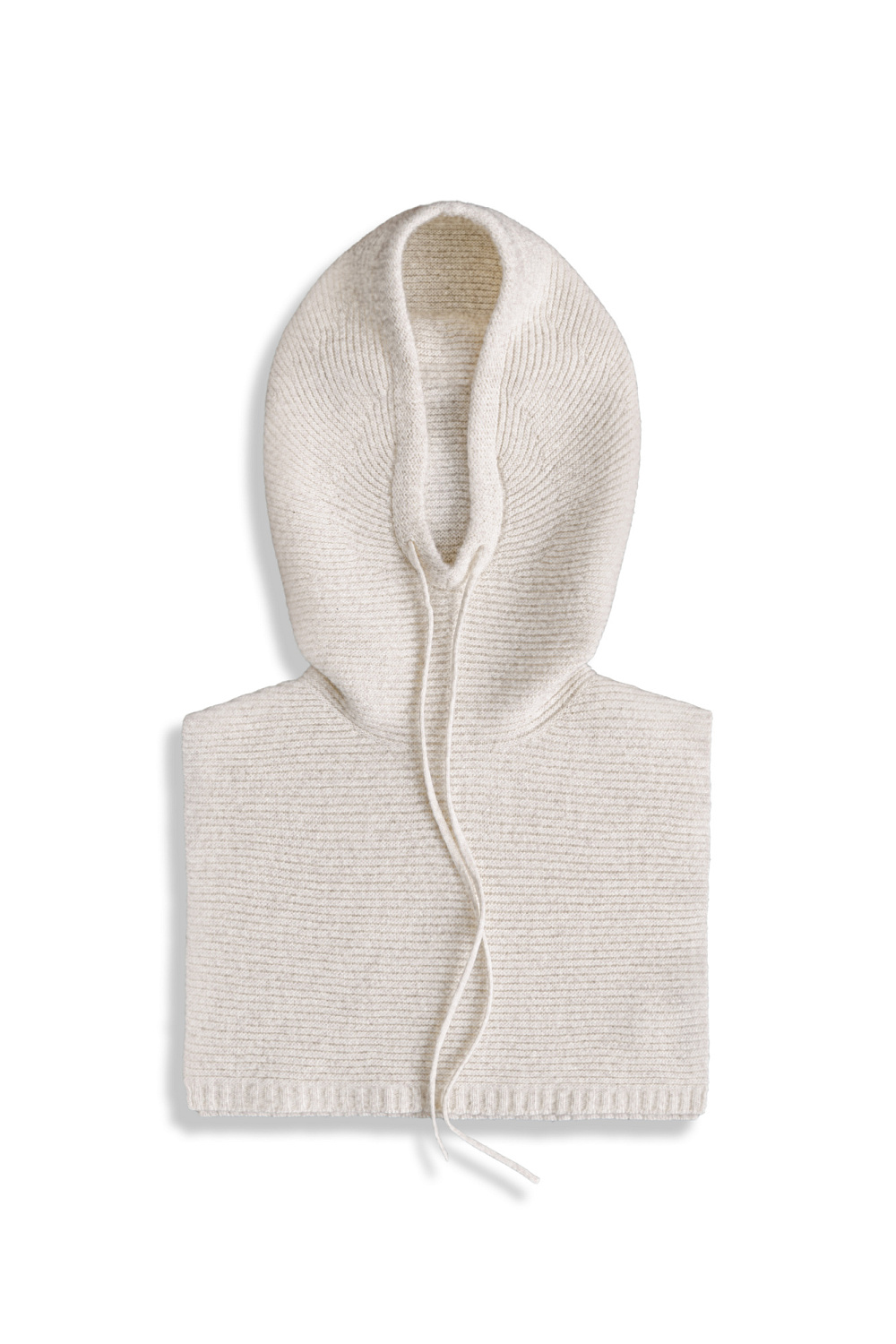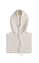 Knitted balaclava with drawstring made in wool and cashmere blend. Rounded edges.