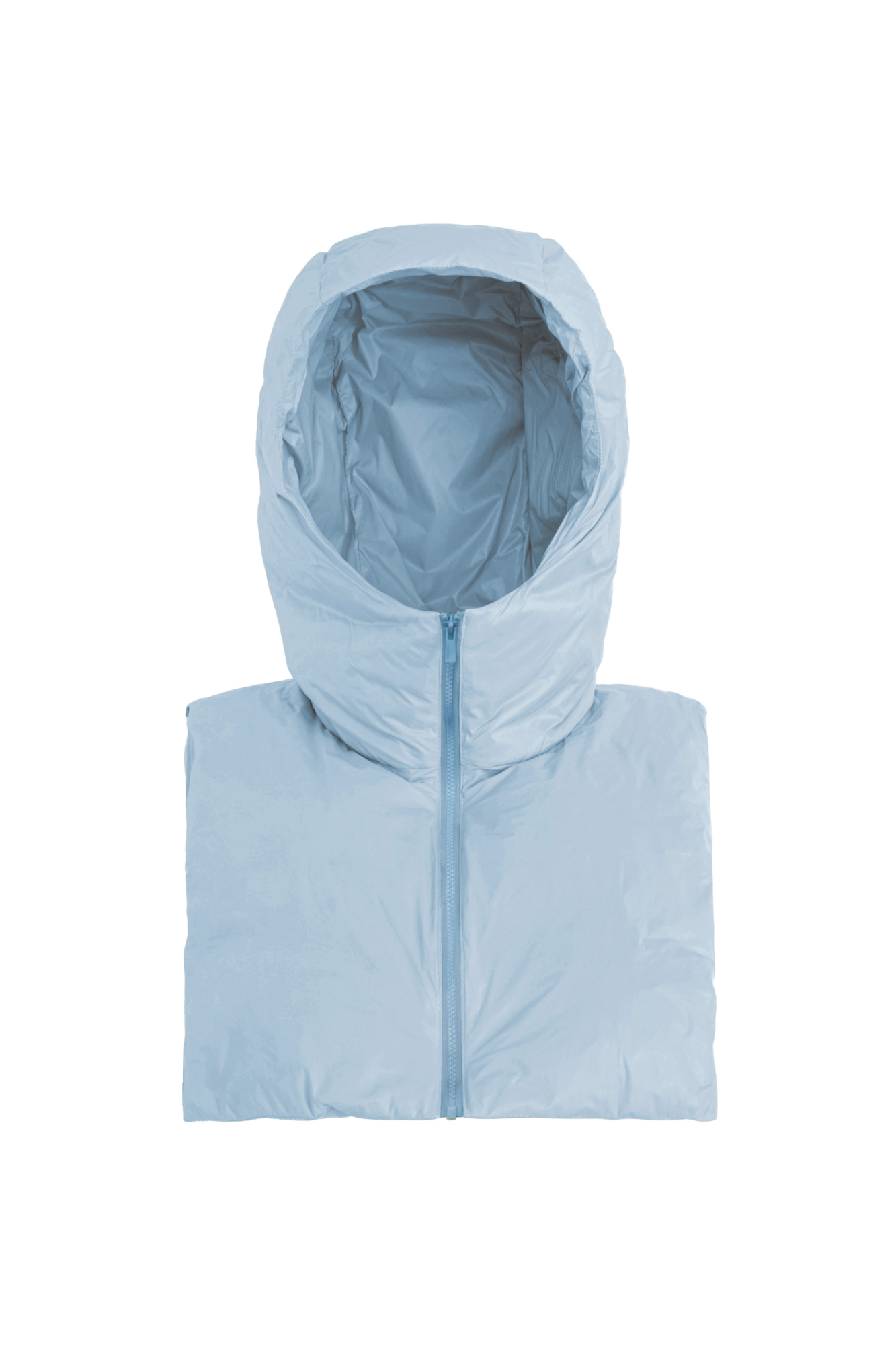 Volume hood with metal zipper and high collar.