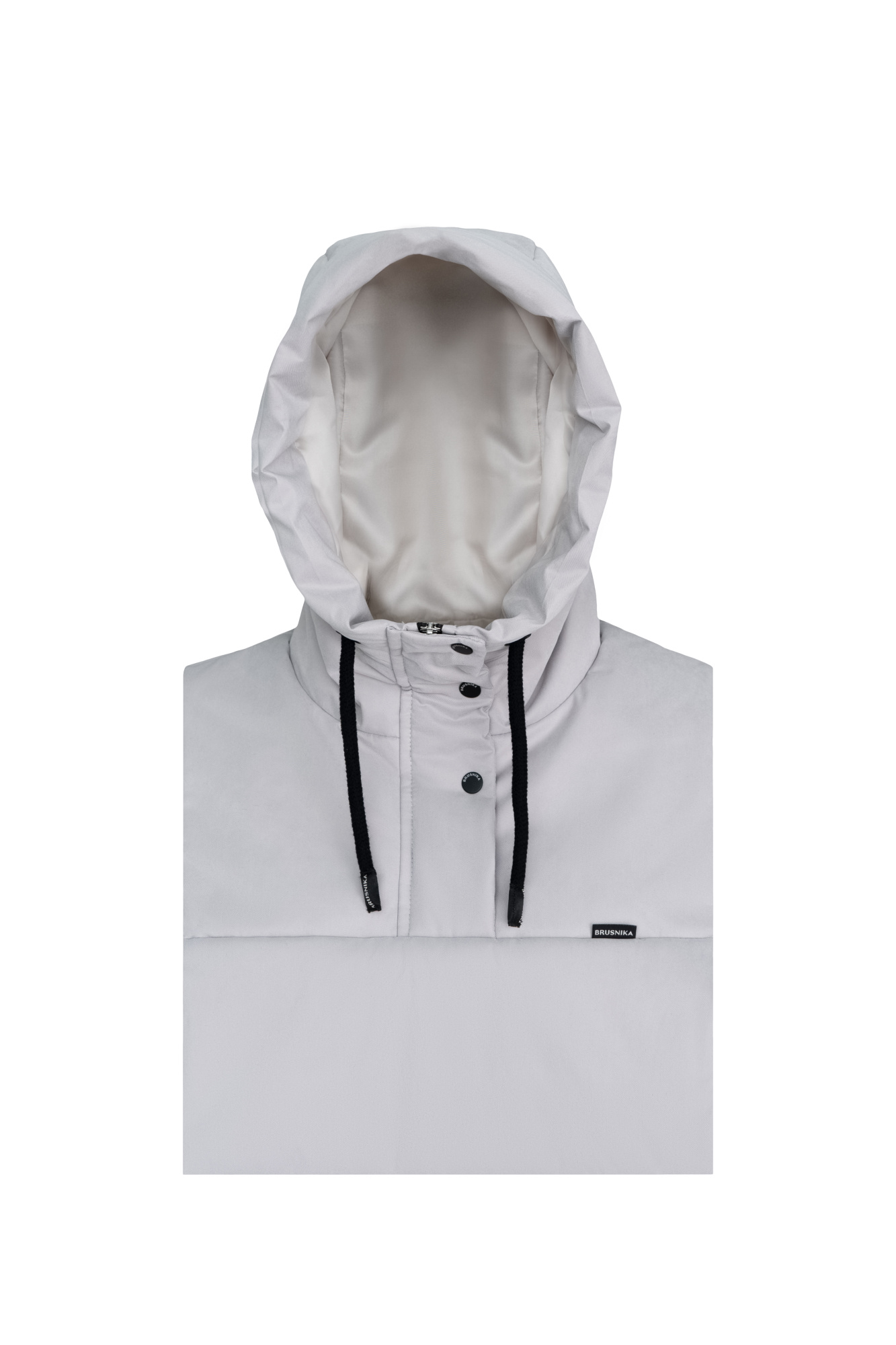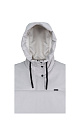 Hood with with drawstring and logo. Zip and snap button closure.