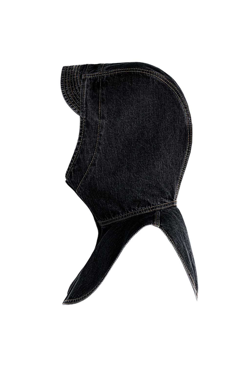 Denim hood made of 100% cotton. The product is made with a branded label on the back and a button closure.