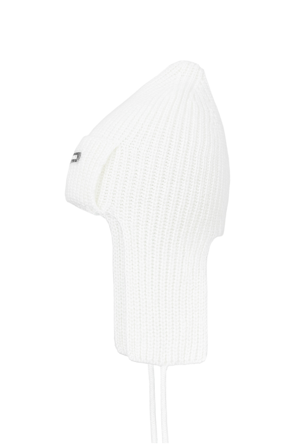 Knit angora earflap hat with a lapel, branded label and ties.
