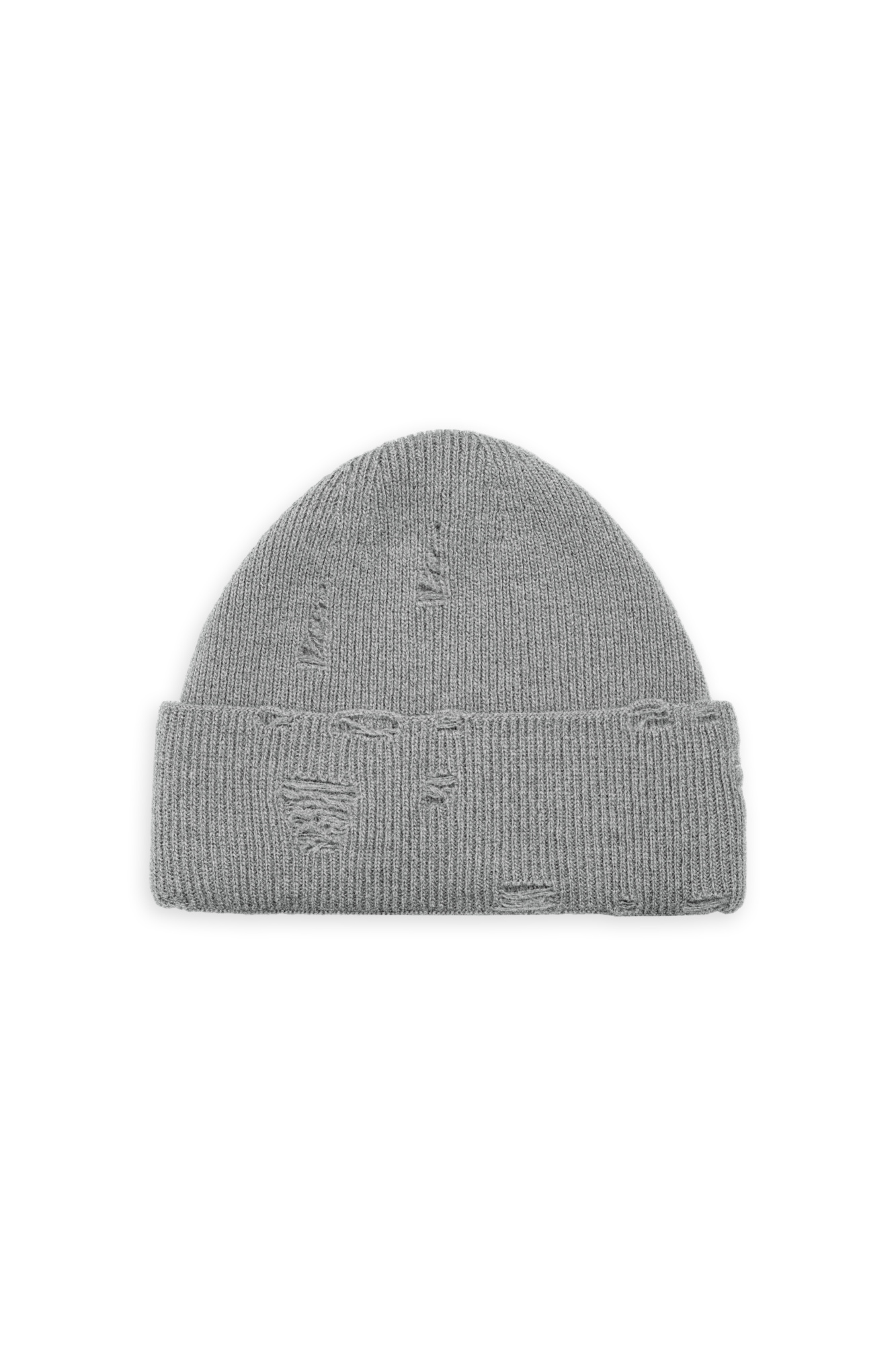 Ripped knitted beanie with foldover cuff. Made from a wool blend with cashmere added.