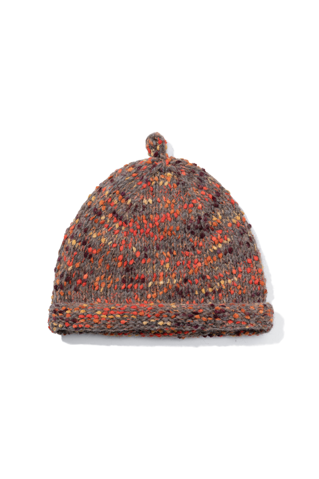 Knitted docker hat with a snug fit and a rolled edge. Model made of bouclé yarn with the addition of alpaca wool.