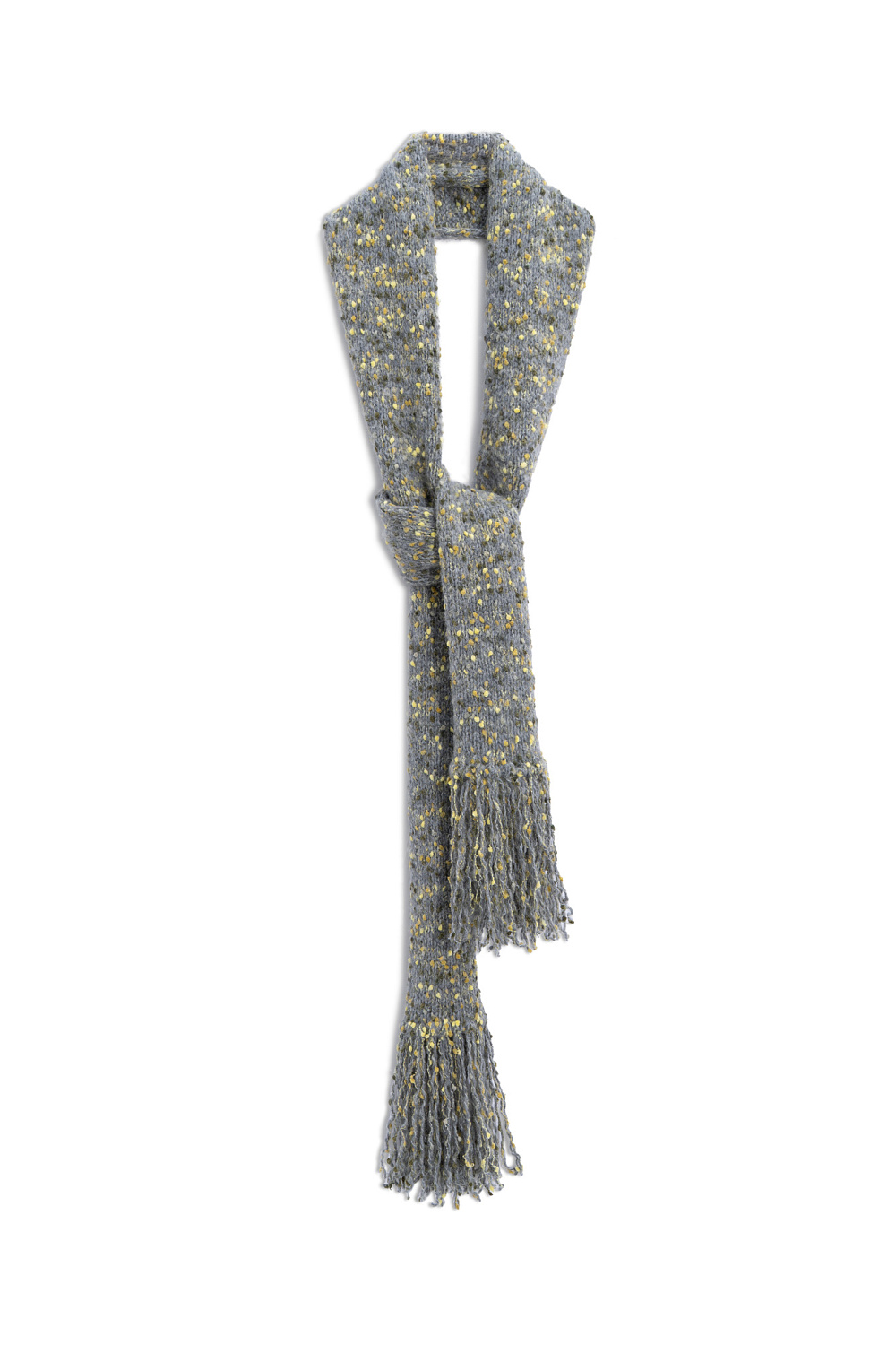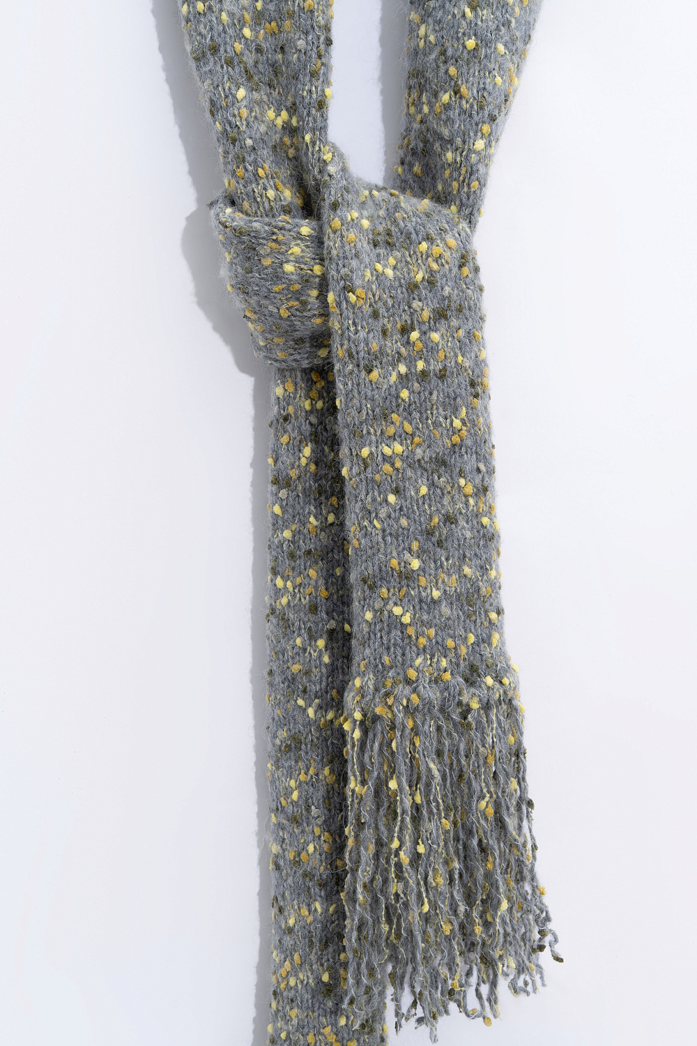 Knitted bouclé scarf with long fringe.