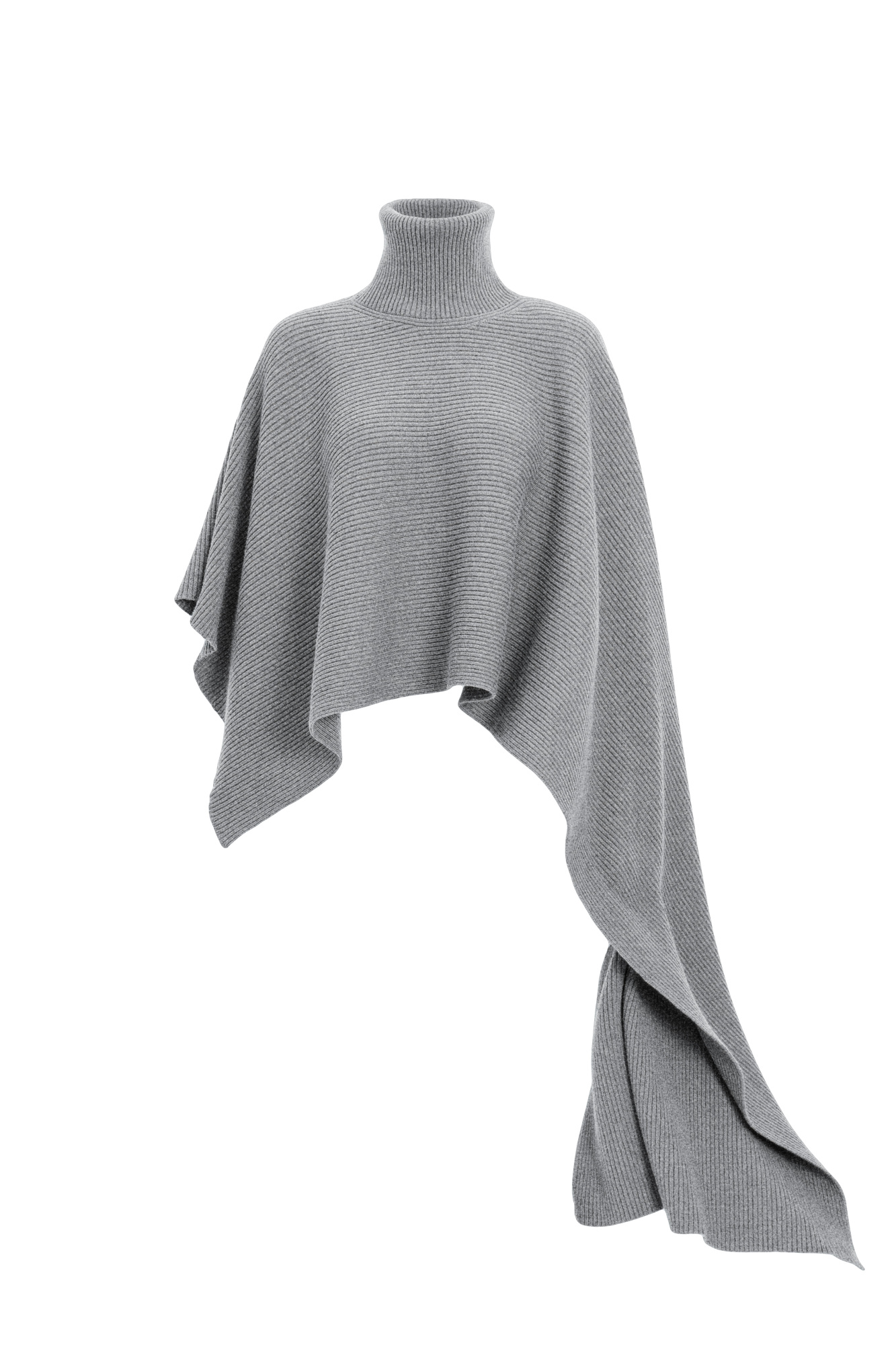 Rib-knit scarf-poncho made in wool and cashmere. Asymmetrical hem and high neck.