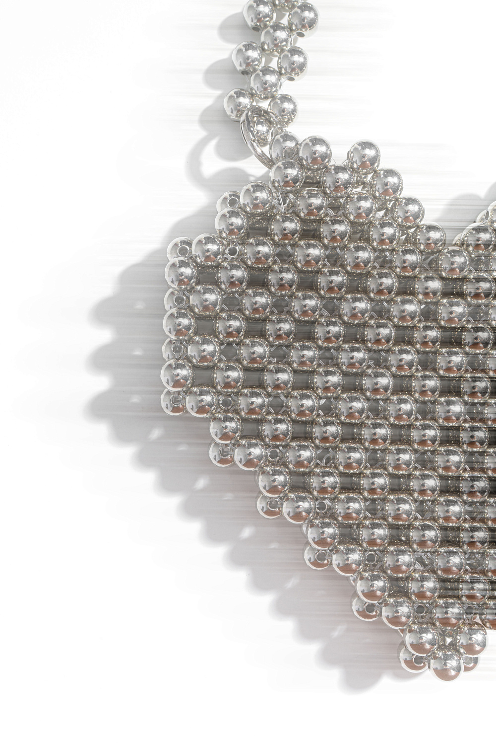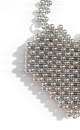 Handbag in the shape of a heart. made by interlacing metal beads of the same diameter. Model with one short handle on carabiners. The height of the product is 16 cm, the length of the handles is 26 cm.
