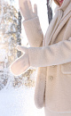 Wool mittens with added fox fluff. Model with long cuff.