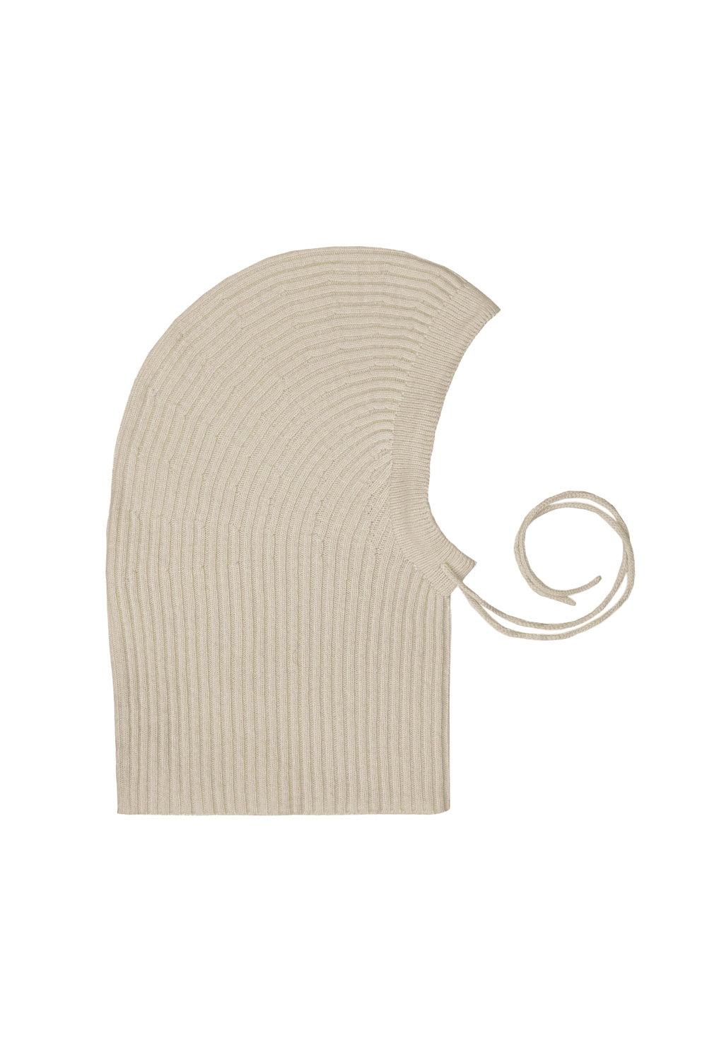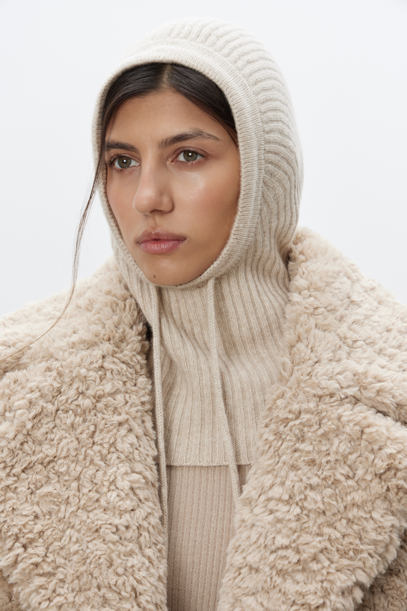 Balaclava made of wool and cashmere with a drawstring. Ribbed edges. You can complete the look with gloves and a scarf.