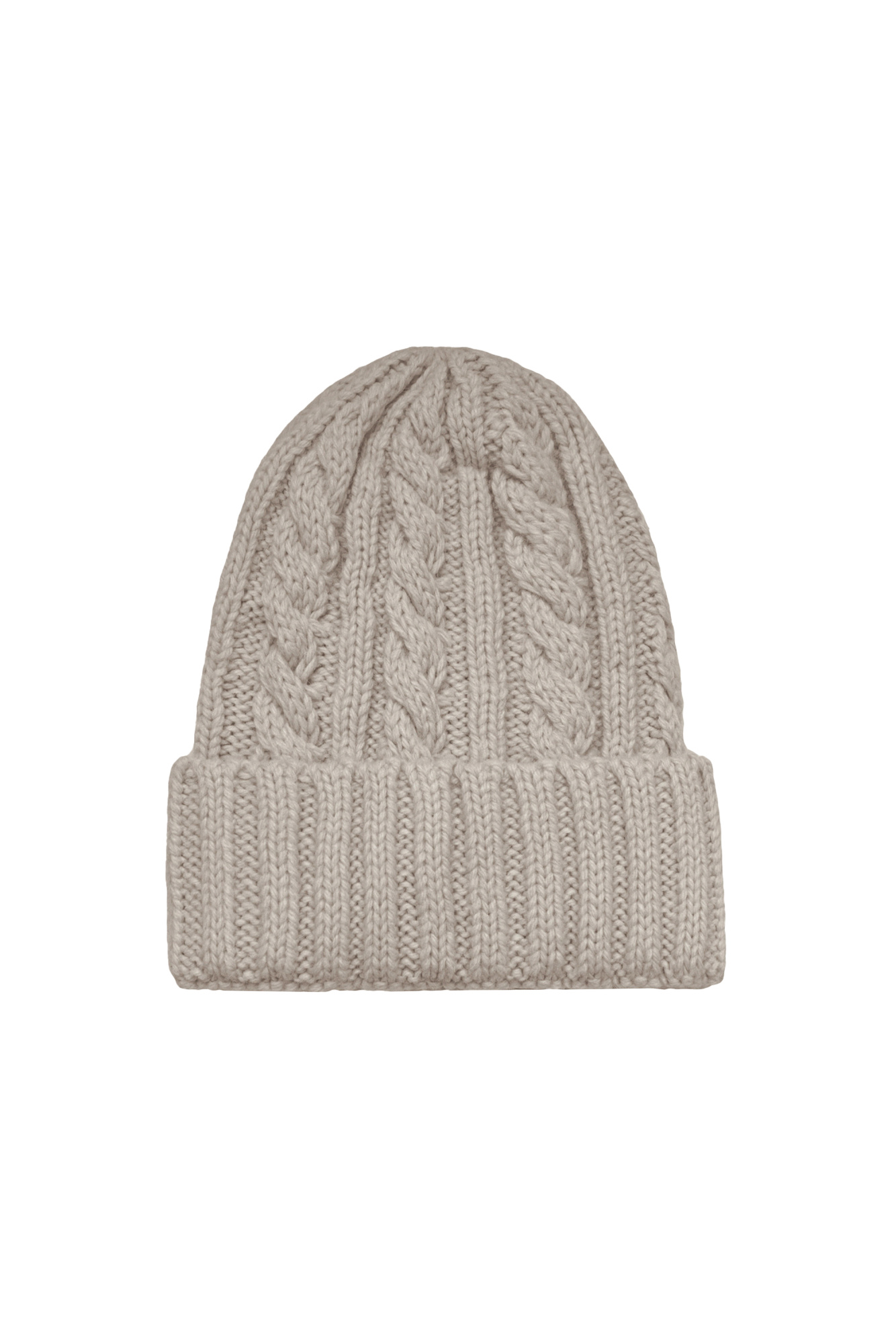 Alpaca wool cable knit hat with a wide turn-up at the hem.