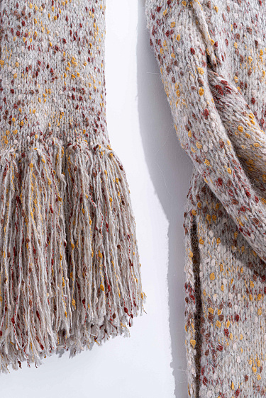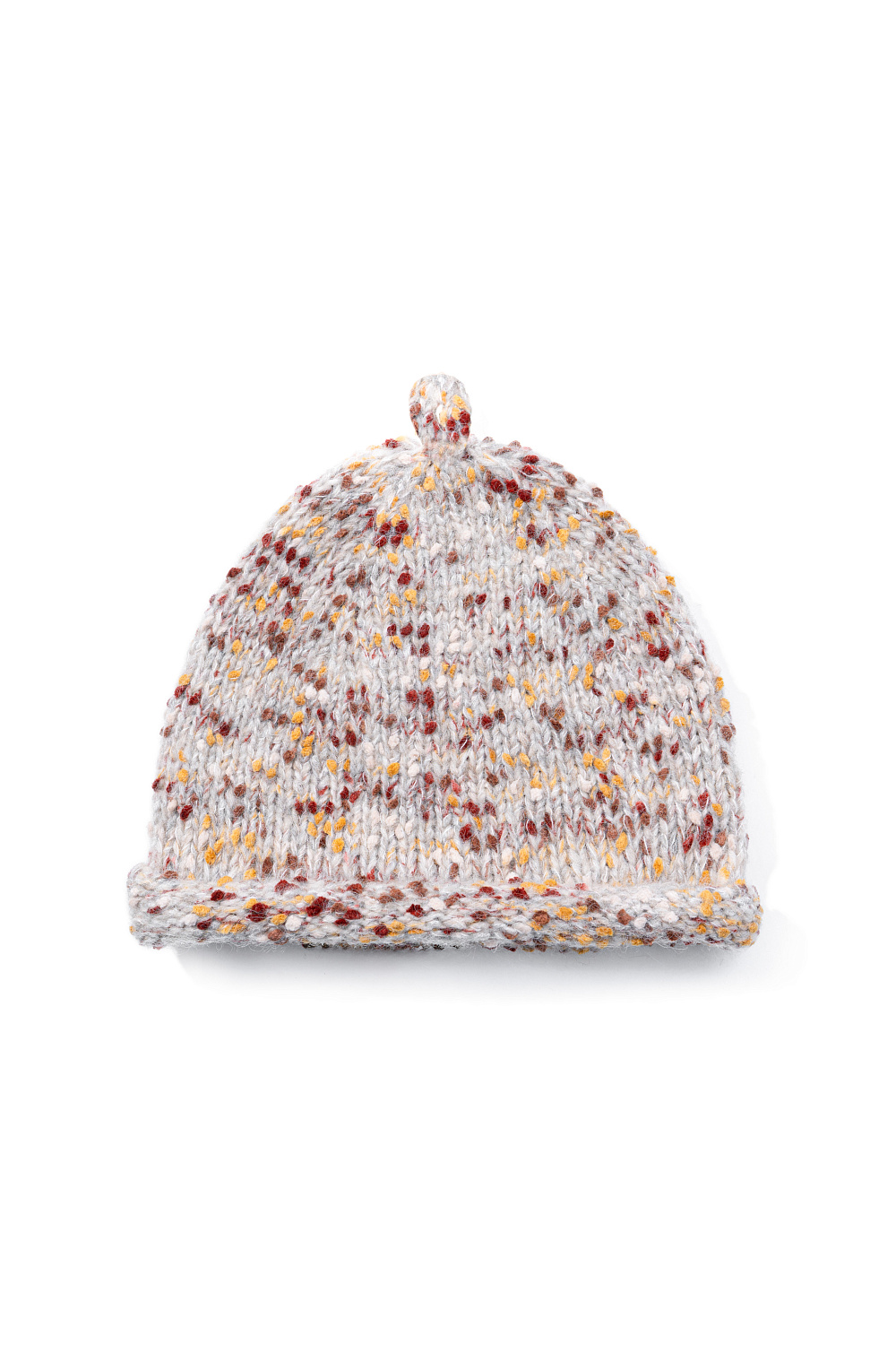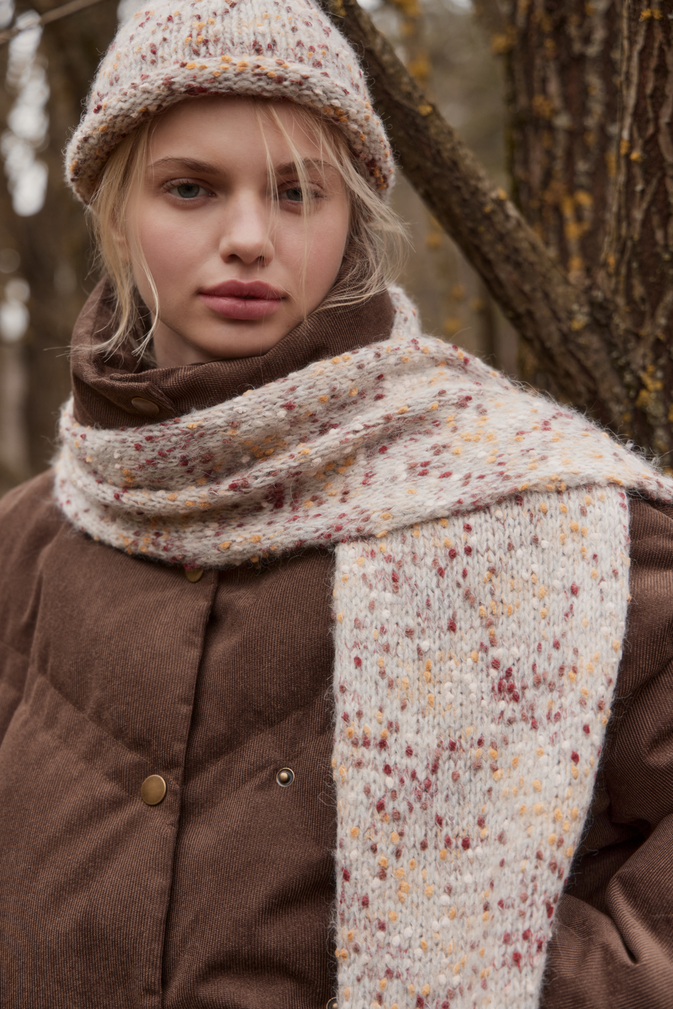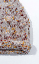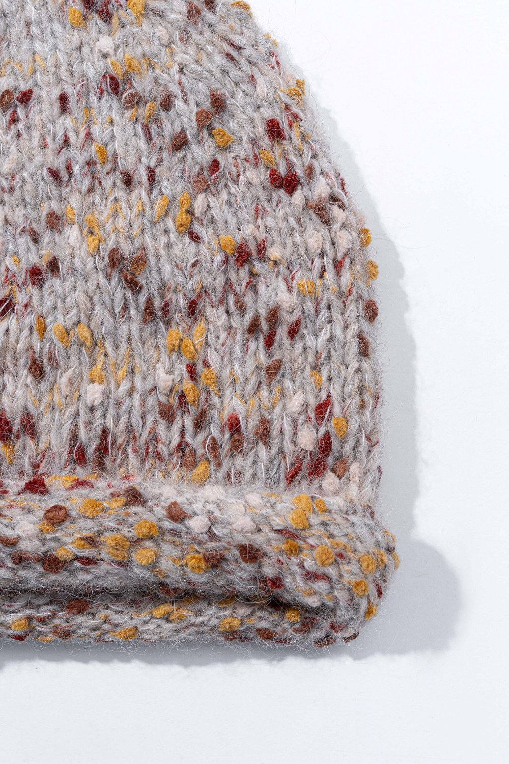 Knitted docker hat with a snug fit and a rolled edge. Model made of bouclé yarn with the addition of alpaca wool.