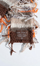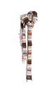 Narrow scarf made of superfine alpaca and extrafine merino wool. The model is made of yarn with different textures and decorated with fringe.