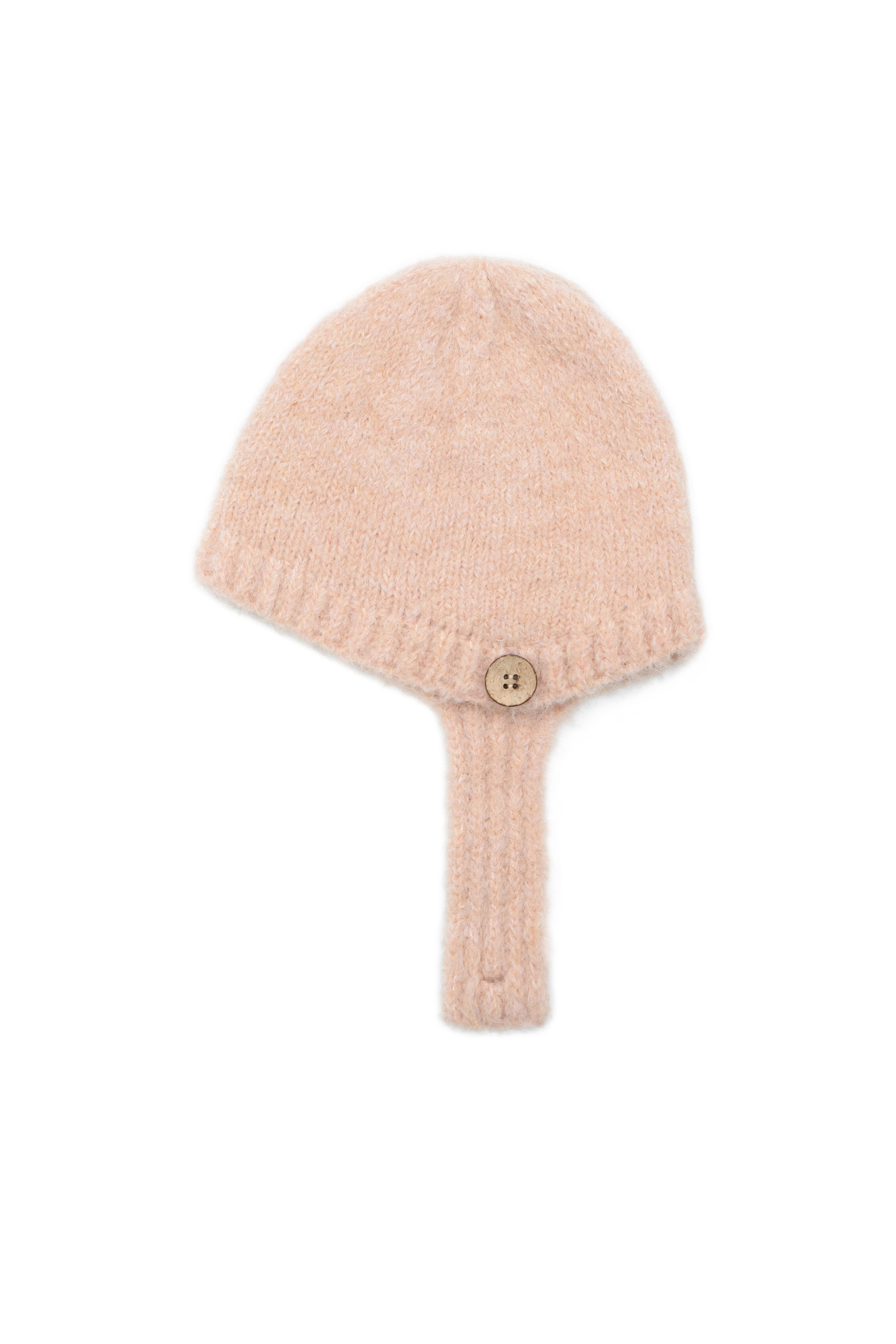 Knitted hat with button fastening. The hat is made of a blend of wool and mohair, ribbed edges.