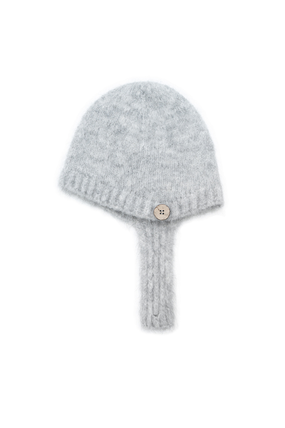 Knitted hat with button fastening. The hat is made of a blend of wool and mohair, ribbed edges.