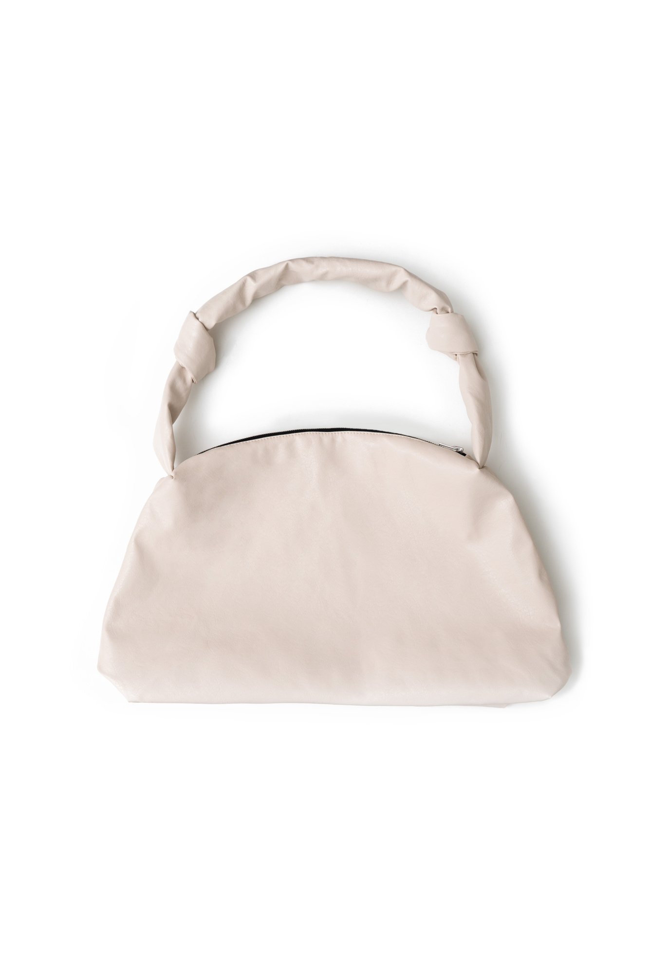 Faux-leather bag with zipper and knots on the handle. Handle length 80 cm.
