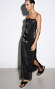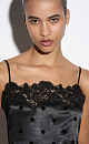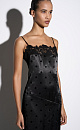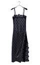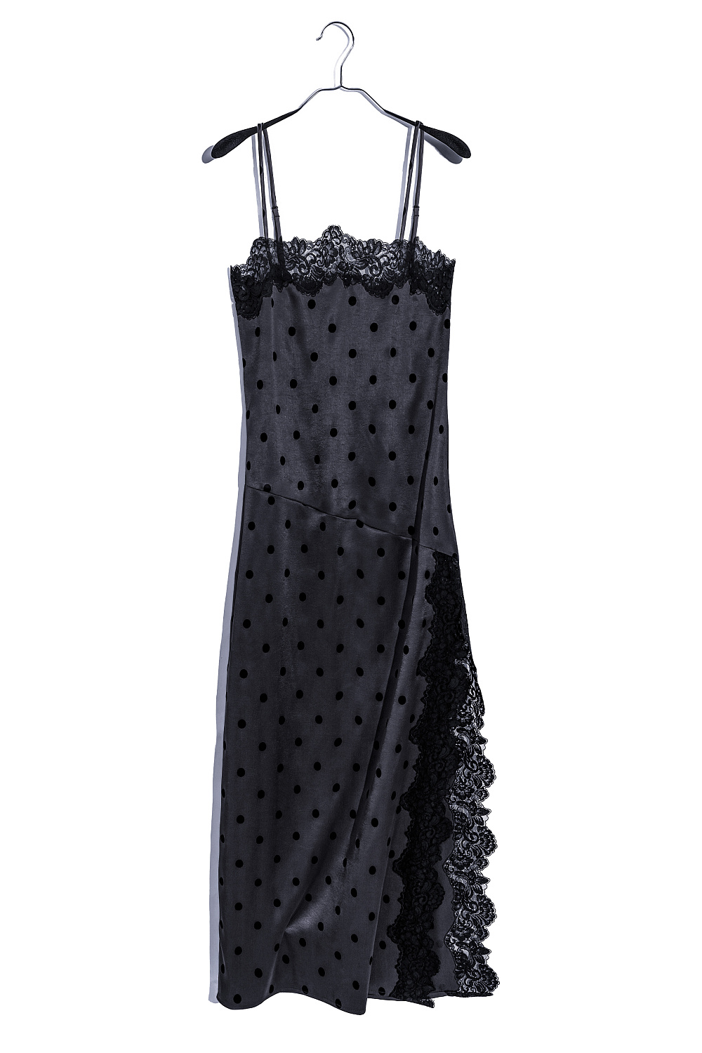 Satin maxi slip dress with polka dots. The model has a fitted silhouette with thin straps and a high slit on the side. The product is decorated with lace.