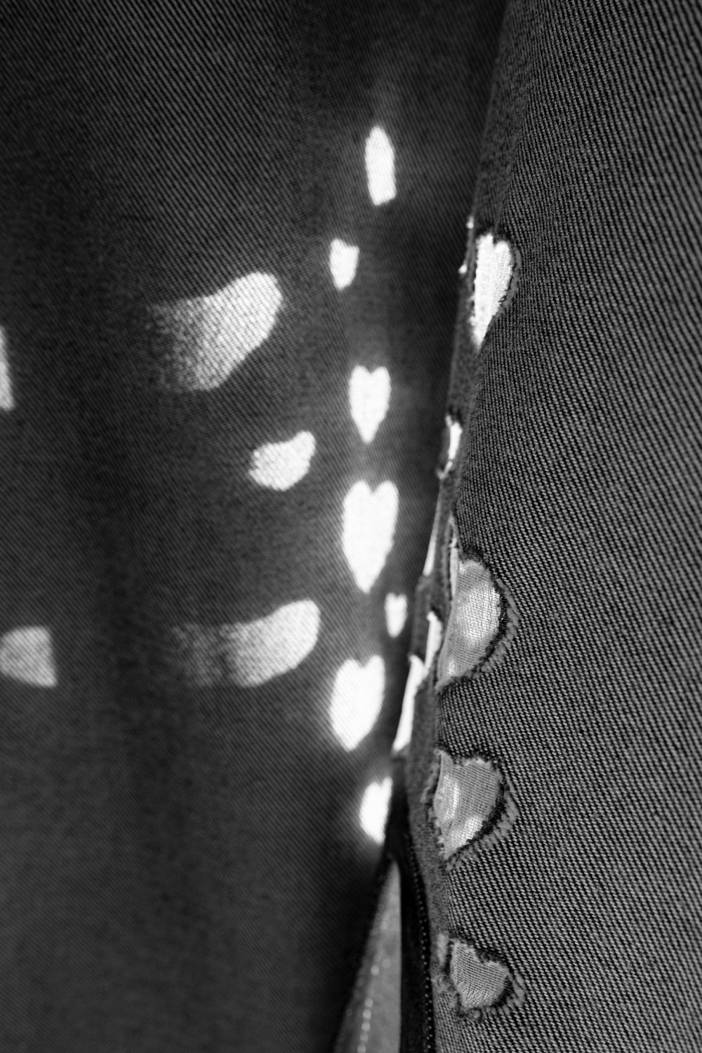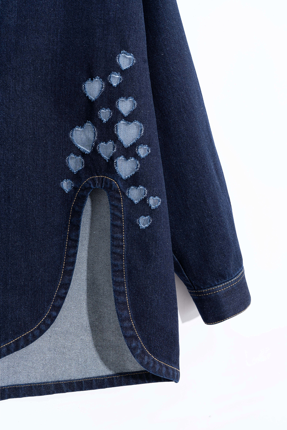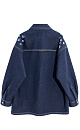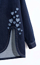 100% cotton denim shirt. Loose fit model with long sleeves, a classic turn-down collar and magnetic snap closure. The product is decorated with a branded button under the collar and on the cuffs, a high textured cut, contrast stitching and perforations in the form of a scattering of hearts.