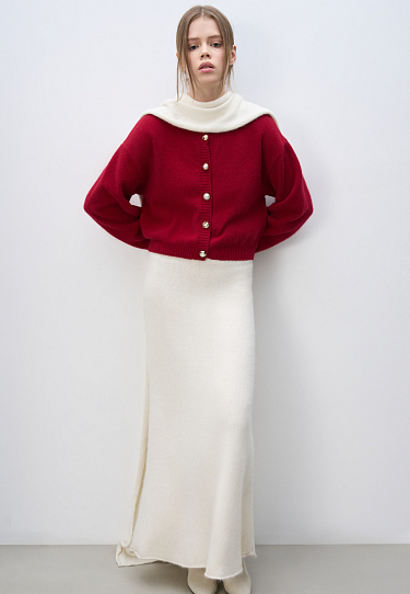 Knitted fox fur T-shirt. Model of a loose silhouette, with short sleeves and a round neckline. The edges of the product are ribbed. You can complement the look with a skirt.