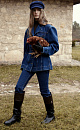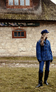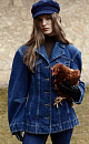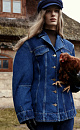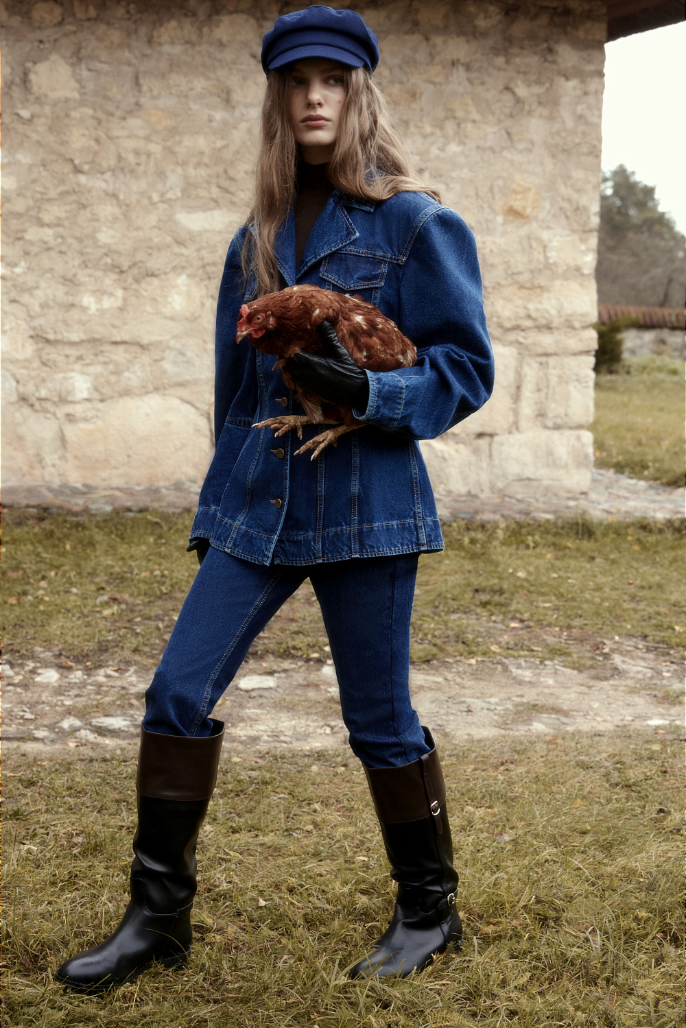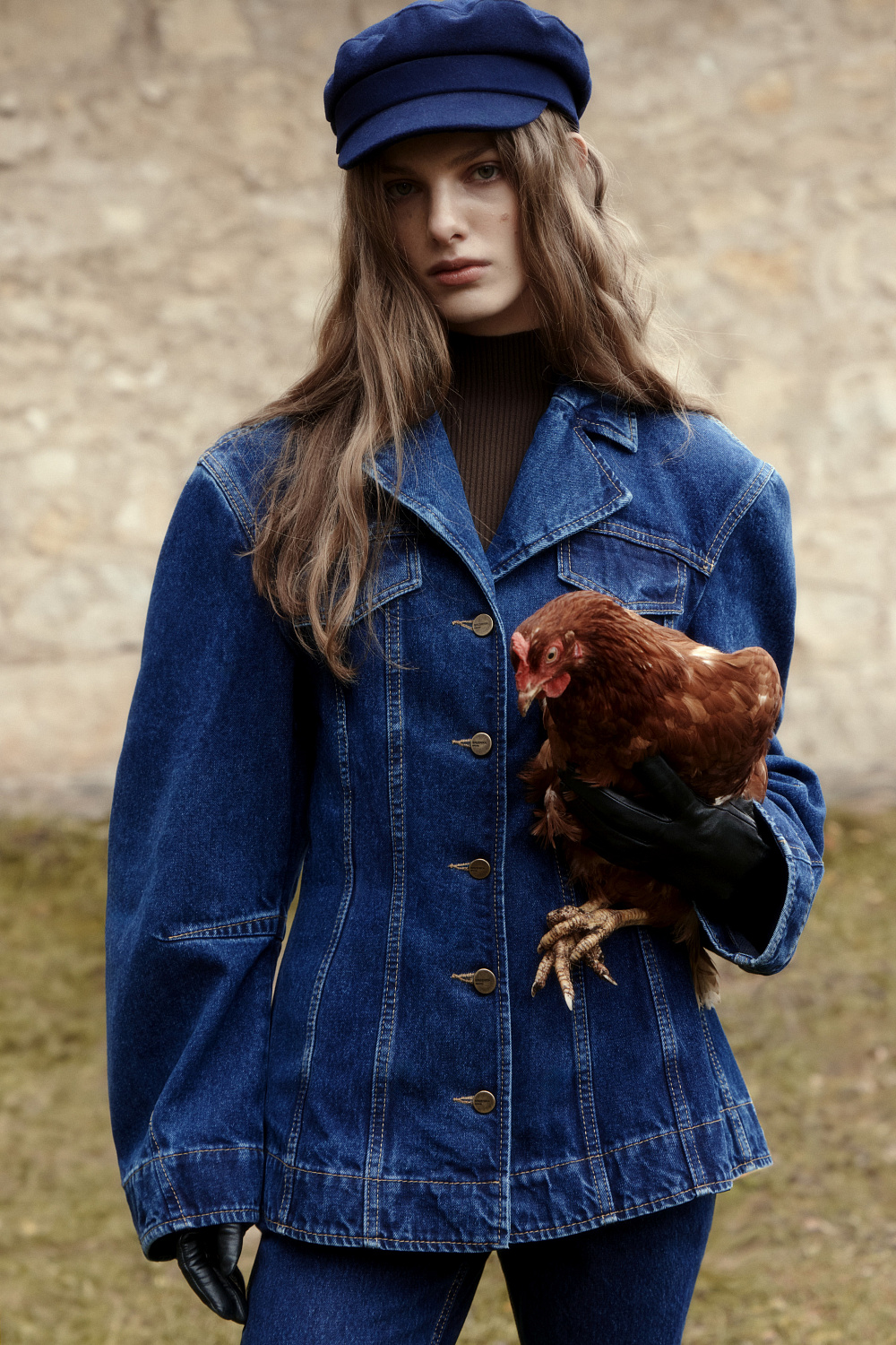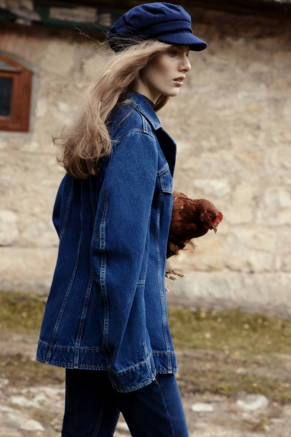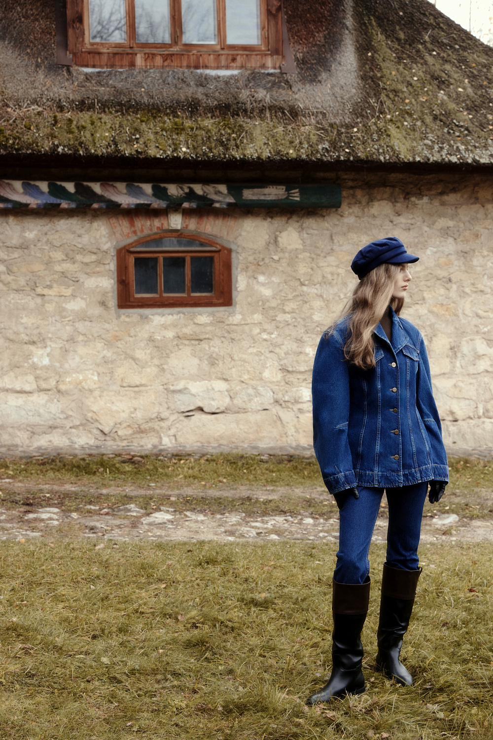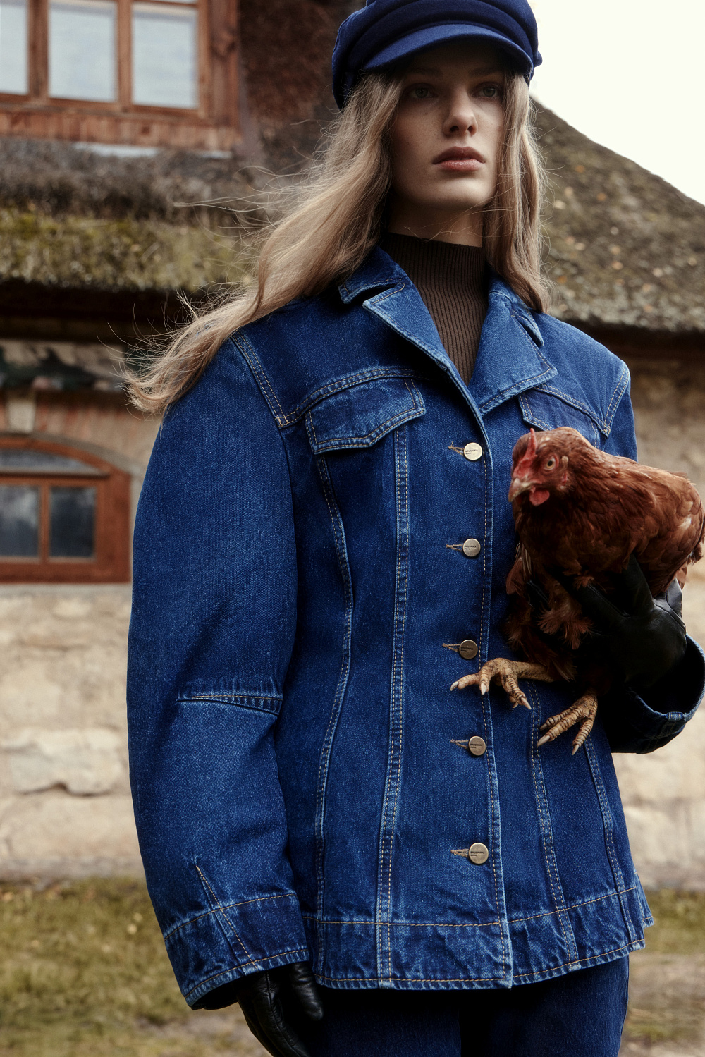 Denim jacket with raised seams. The model has a loose silhouette with dropped shoulders and a fastening with metal buttons.