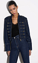 Denim jacket in hussar style, made of 100% cotton. Straight silhouette model with a stand-up collar, patties on the shoulders and sleeve cuffs. The product is decorated with metal branded buttons and contrasting stitching. Zip closure.
