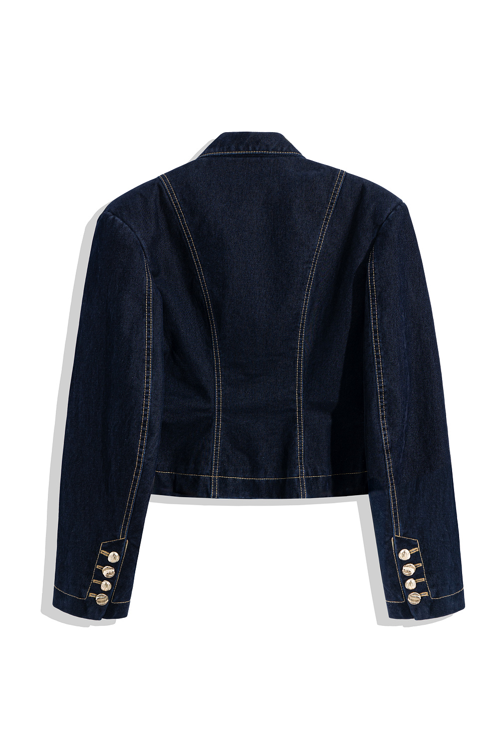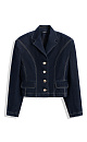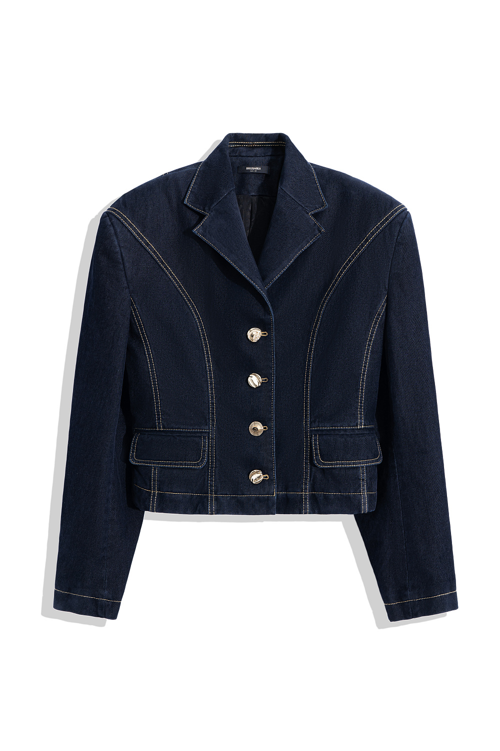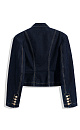Cropped jacket made of flocked denim - 100% cotton with an imitation velvet texture. The model has a fitted silhouette with narrow lapels, flap pockets and shoulder pads. Fastening with large buttons. The product is lined.