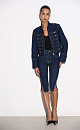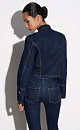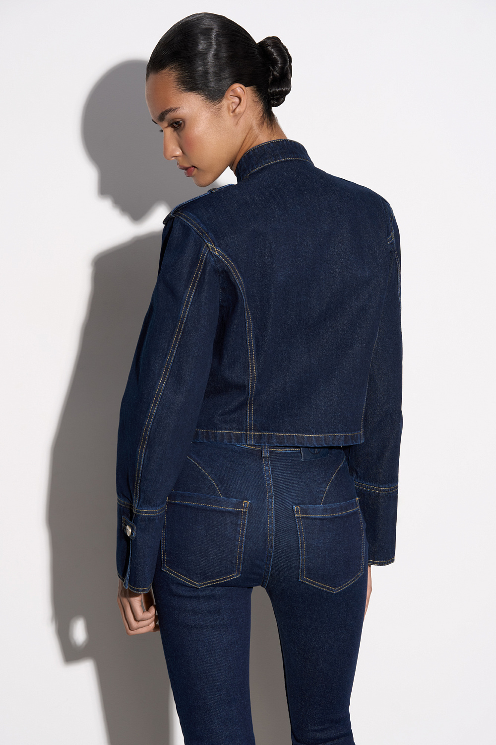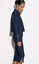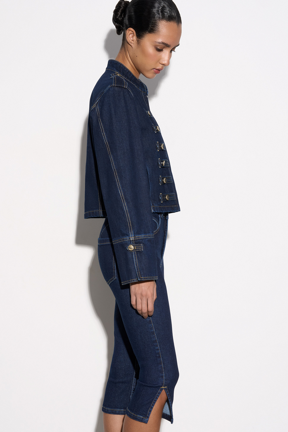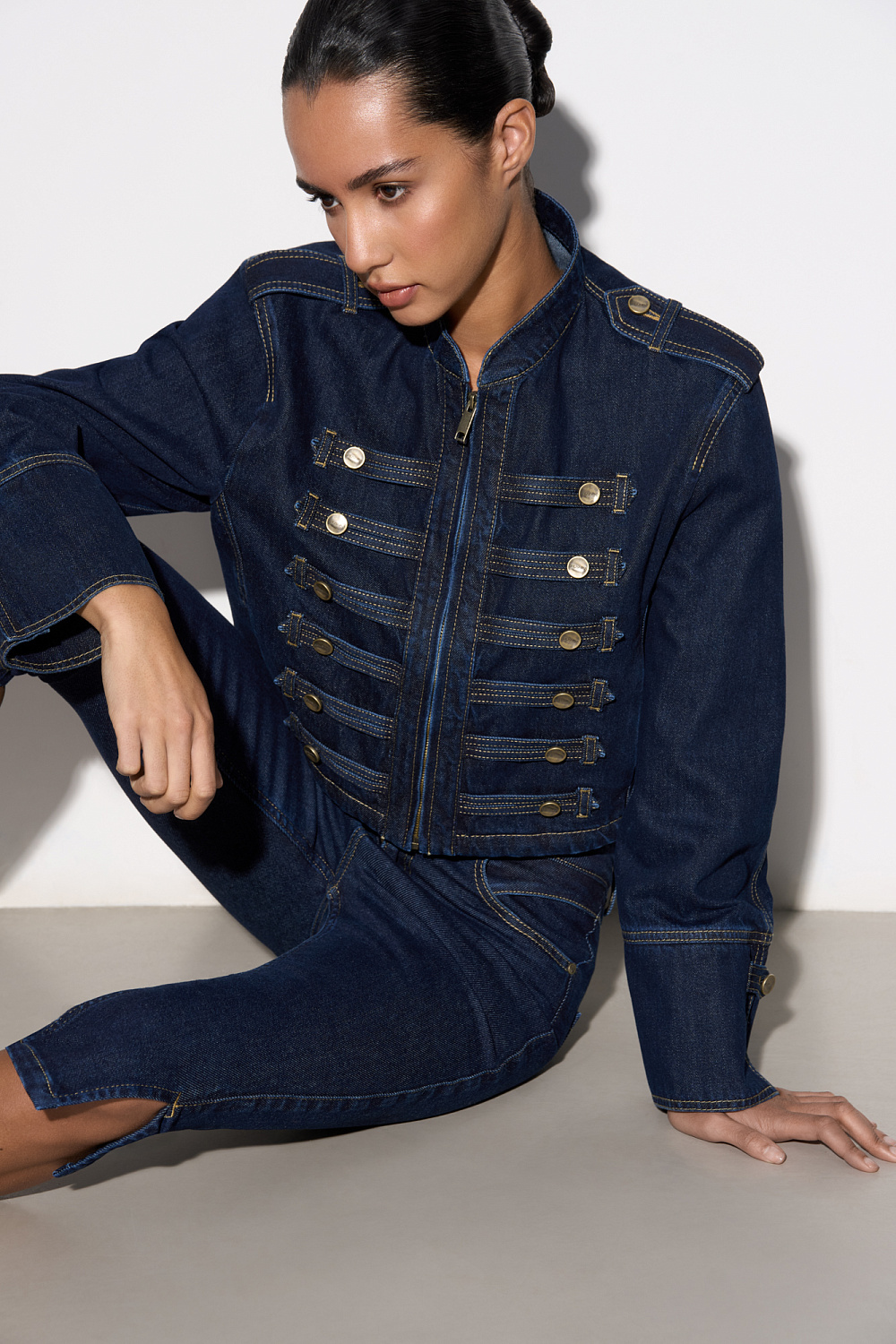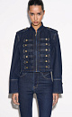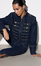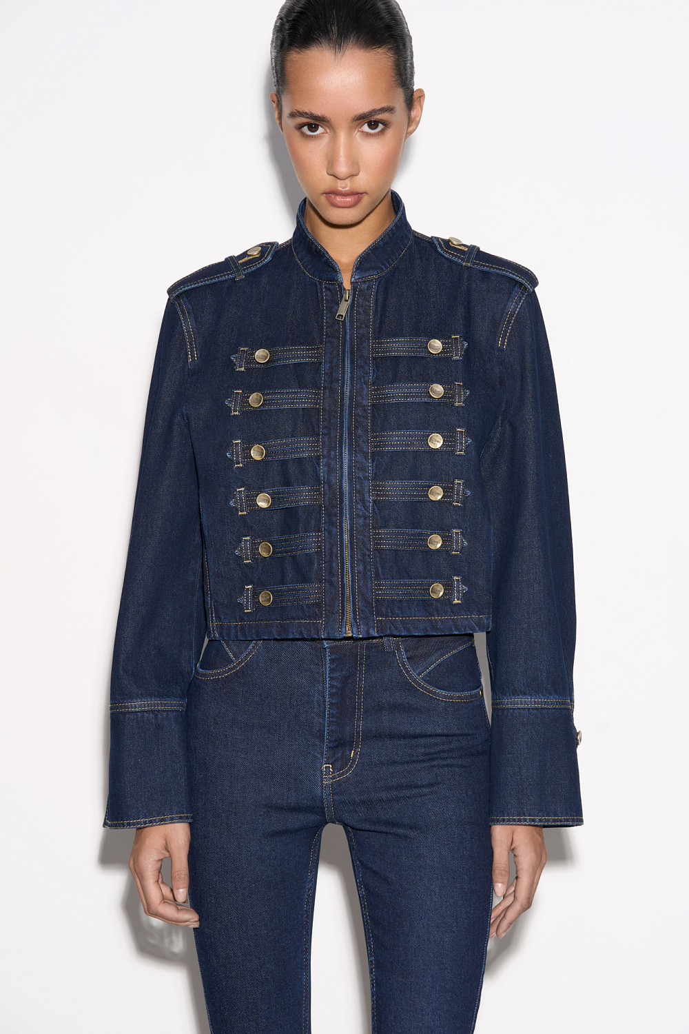 Denim jacket in hussar style, made of 100% cotton. Straight silhouette model with a stand-up collar, patties on the shoulders and sleeve cuffs. The product is decorated with metal branded buttons and contrasting stitching. Zip closure.