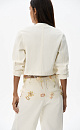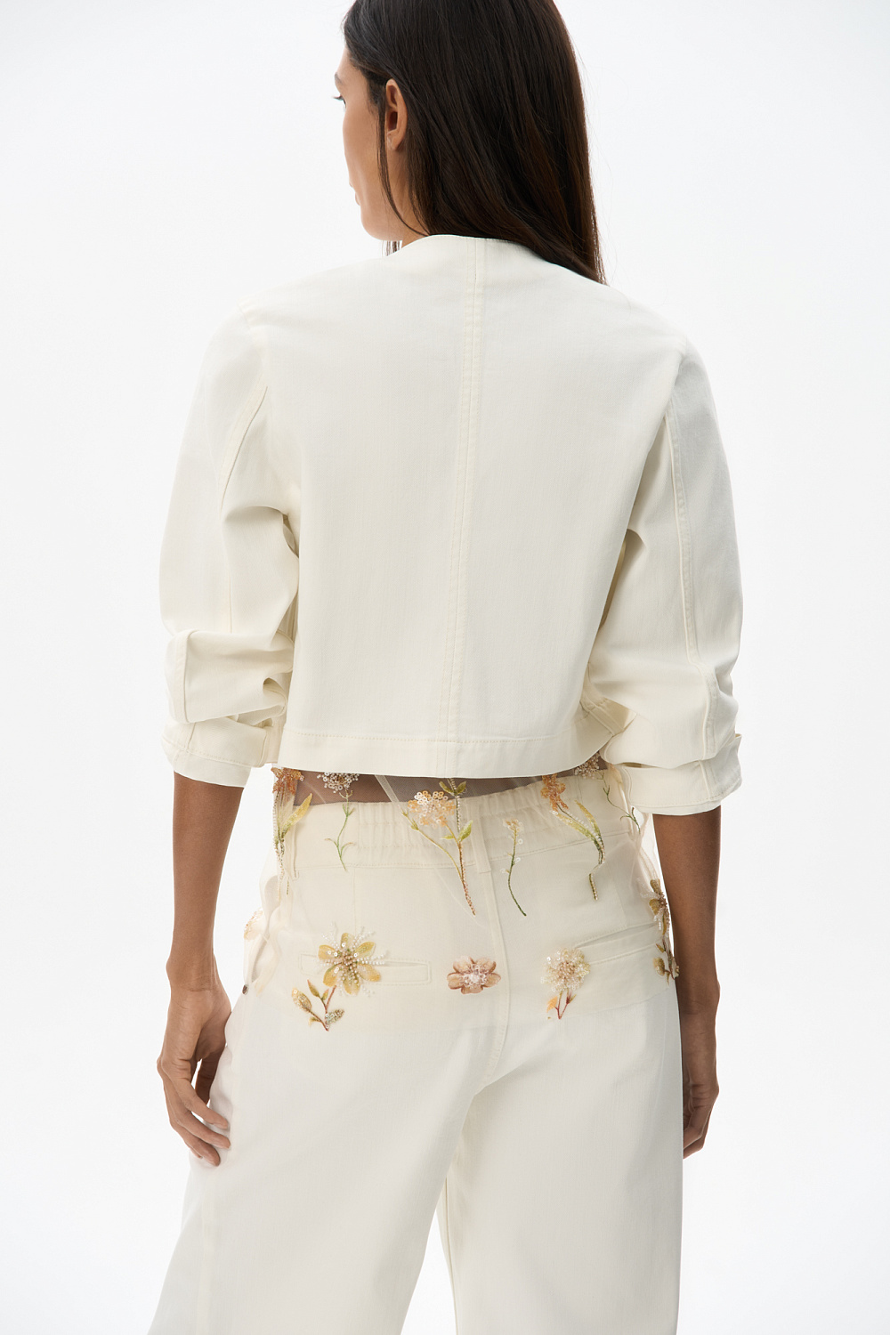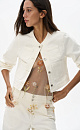 Jacket made of 100% cotton. Model of a loose silhouette with a round neckline without lapels. The product is decorated with patch pockets. Fastening with metal buttons.