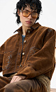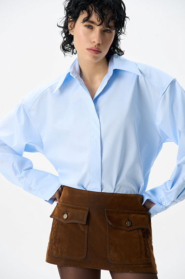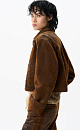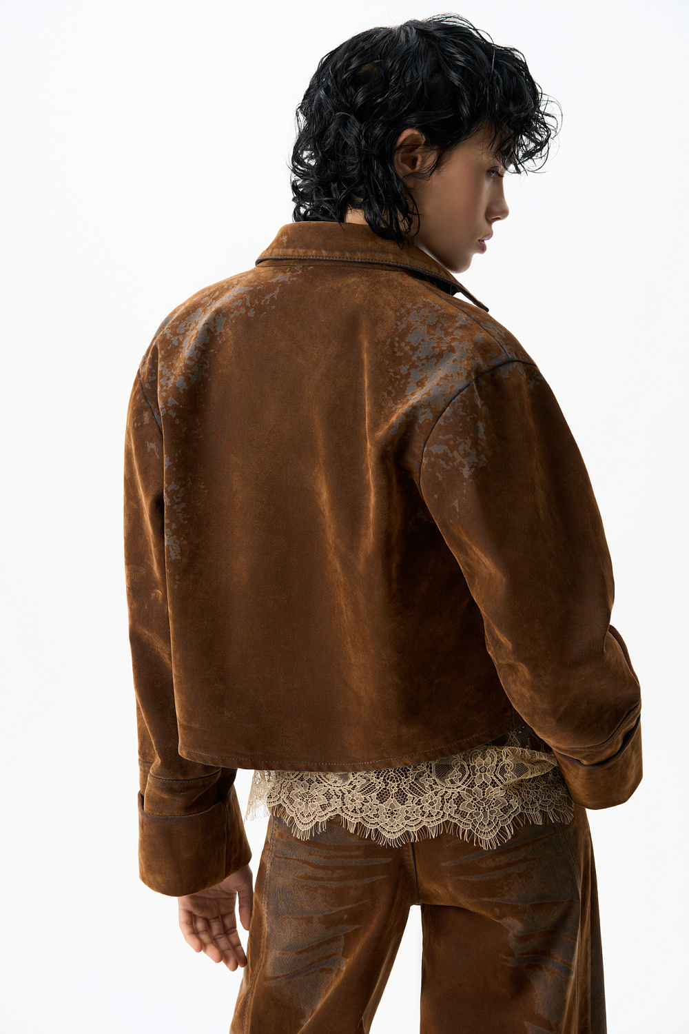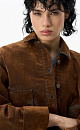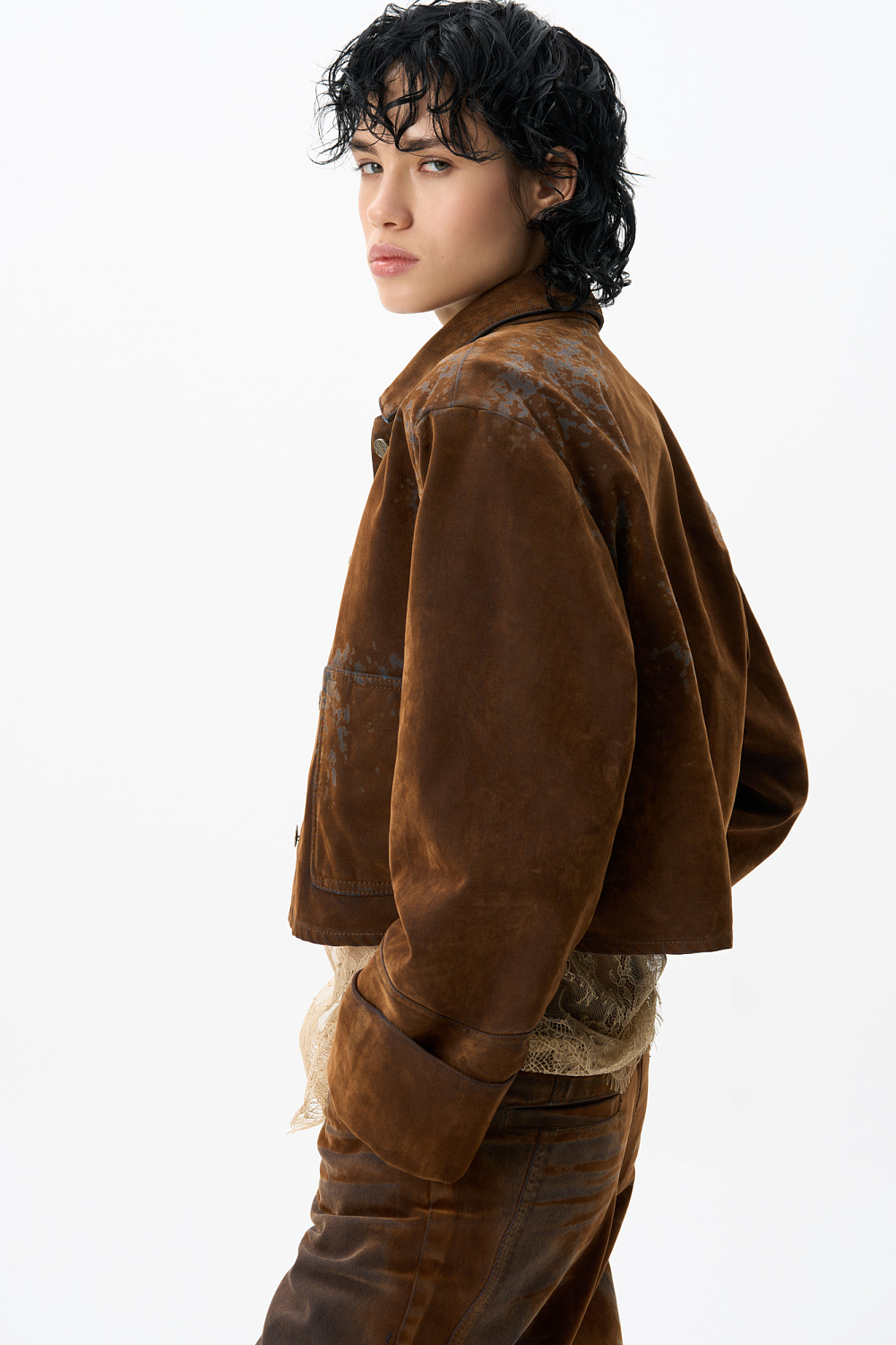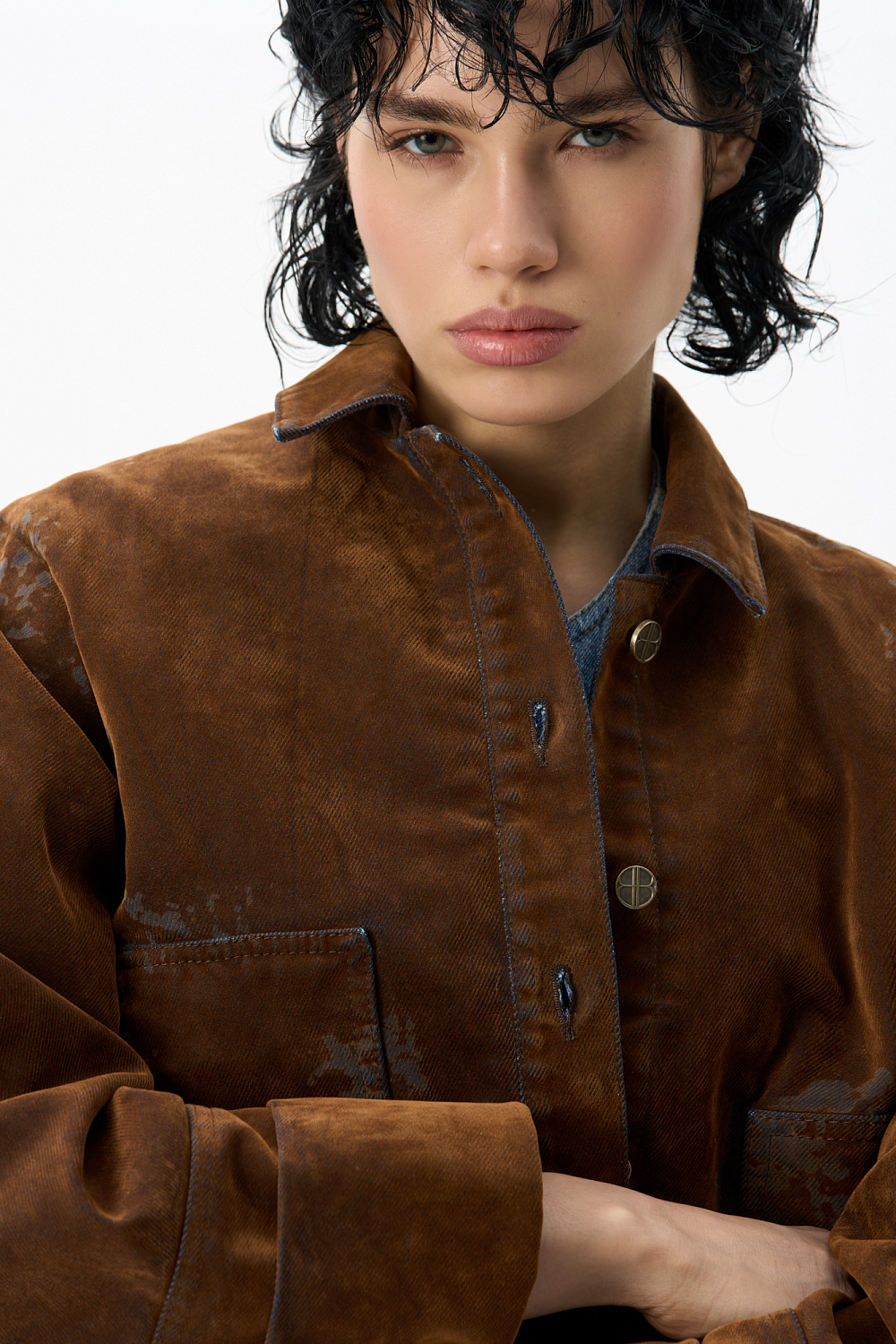 Cropped jacket made of flocked denim - cotton with an imitation velvet texture. Straight-cut model with a turn-down collar, patch pockets and decorative abrasions. Fastening with metal branded buttons.