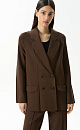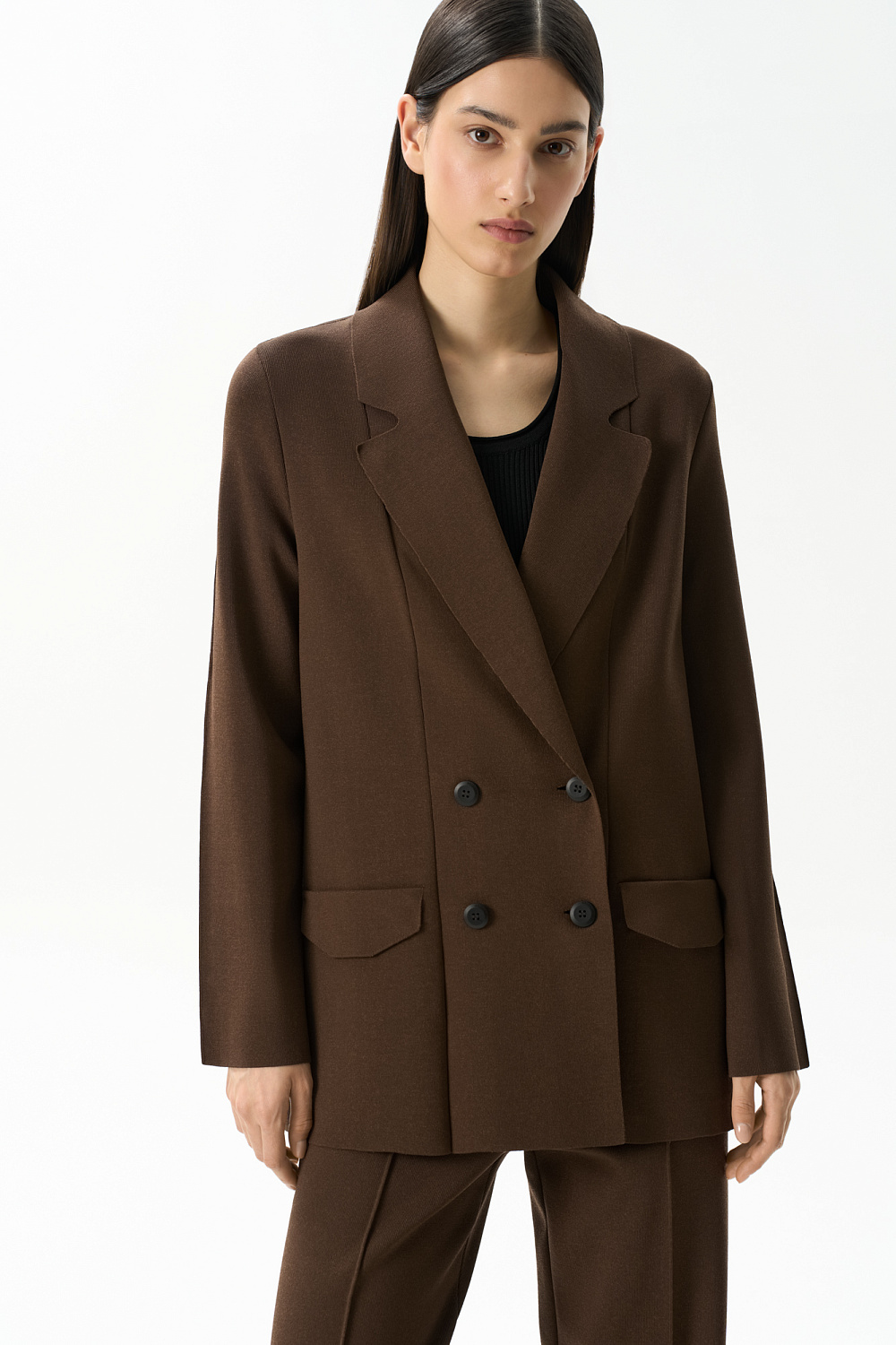Knitted double-breasted viscose jacket. The model has a loose fit, long lapels, knitted pockets and button closure. You can complement the look with trousers.