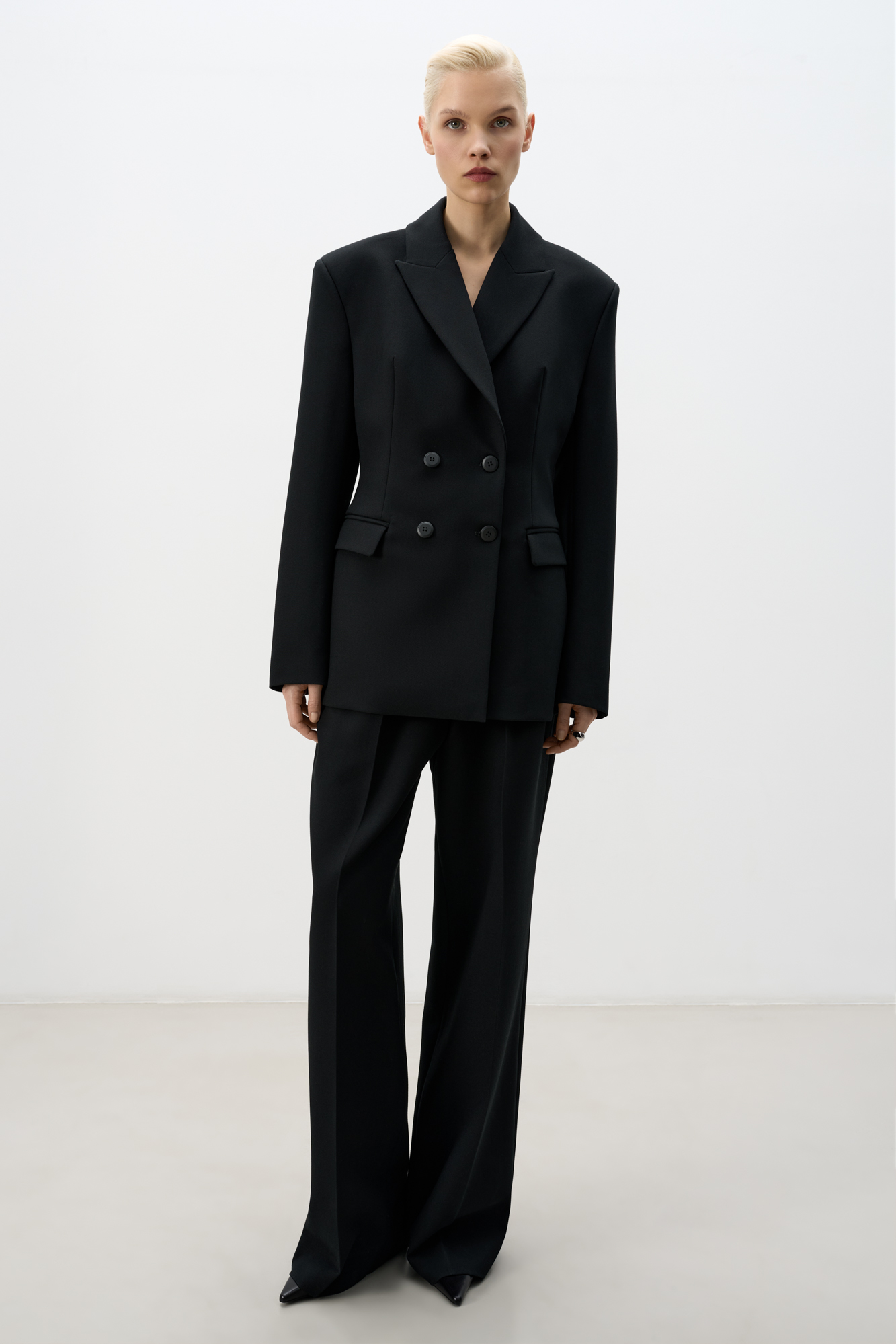 Classic double-breasted polyviscose jacket. The model has a fitted silhouette with darts, two patch pockets with flaps and wide lapels. Button closure. The product is lined.