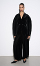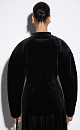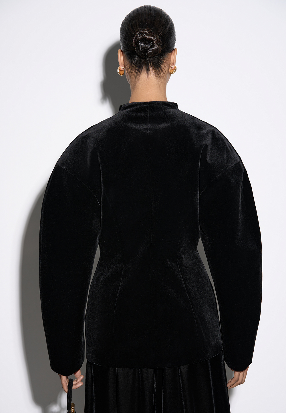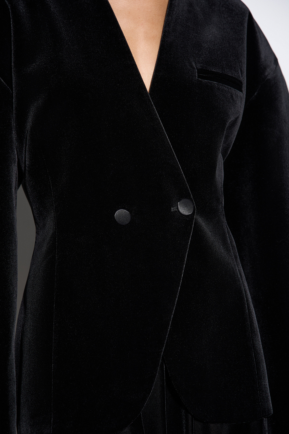 Velvet jacket with voluminous sleeves. The model has a fitted silhouette, with a chest pocket, and a low collar without lapels. Shoulders with shoulder pads. The product is lined.