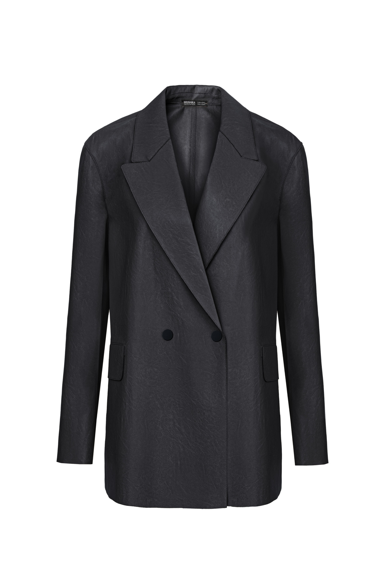 Faux leather blazer with English collar and patch pockets. Button closure. Unlined.
