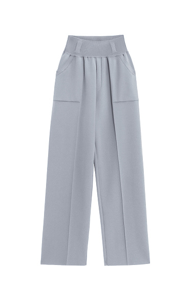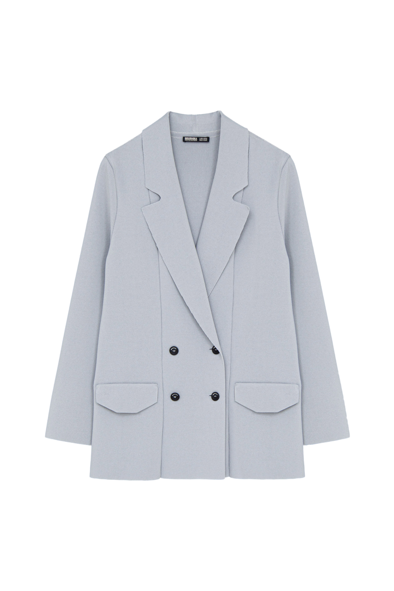 Knitted double-breasted viscose jacket. The model has a loose fit, long lapels, knitted pockets and button closure. You can complement the look with trousers.