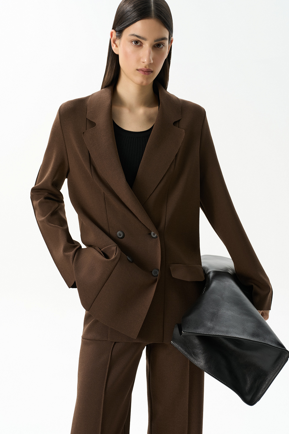 Knitted double-breasted viscose jacket. The model has a loose fit, long lapels, knitted pockets and button closure. You can complement the look with trousers.