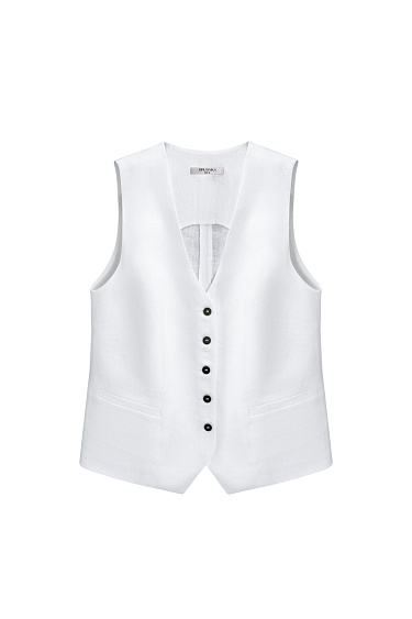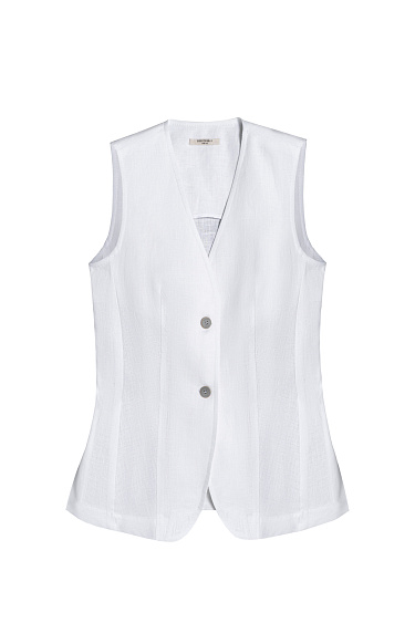 Double-breasted jacket with stitching made from 100% linen. Straight cut model with lapels. Two welt pockets with flaps and a chest pocket. The cuffs are decorated with buttons.