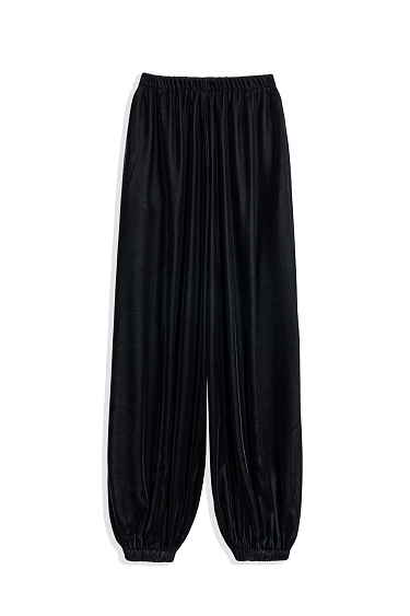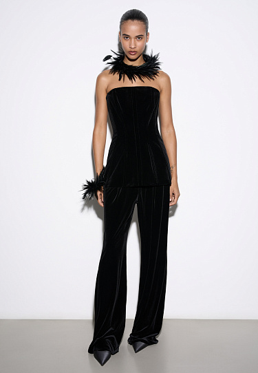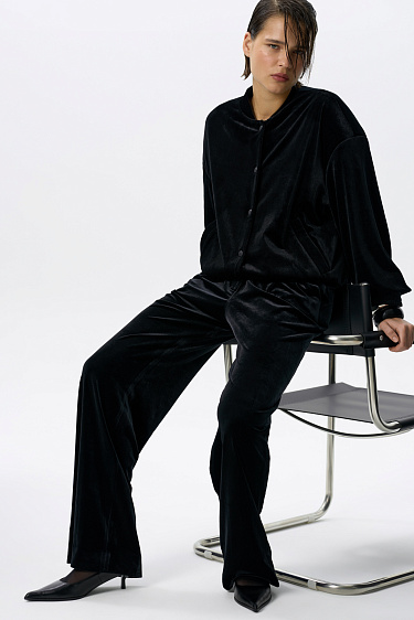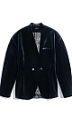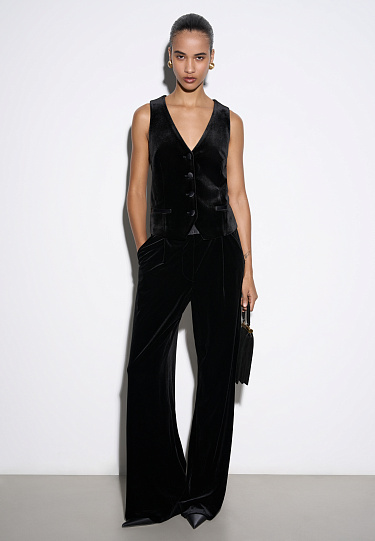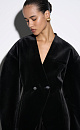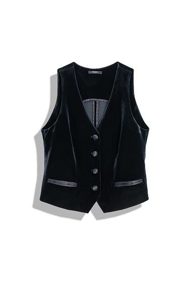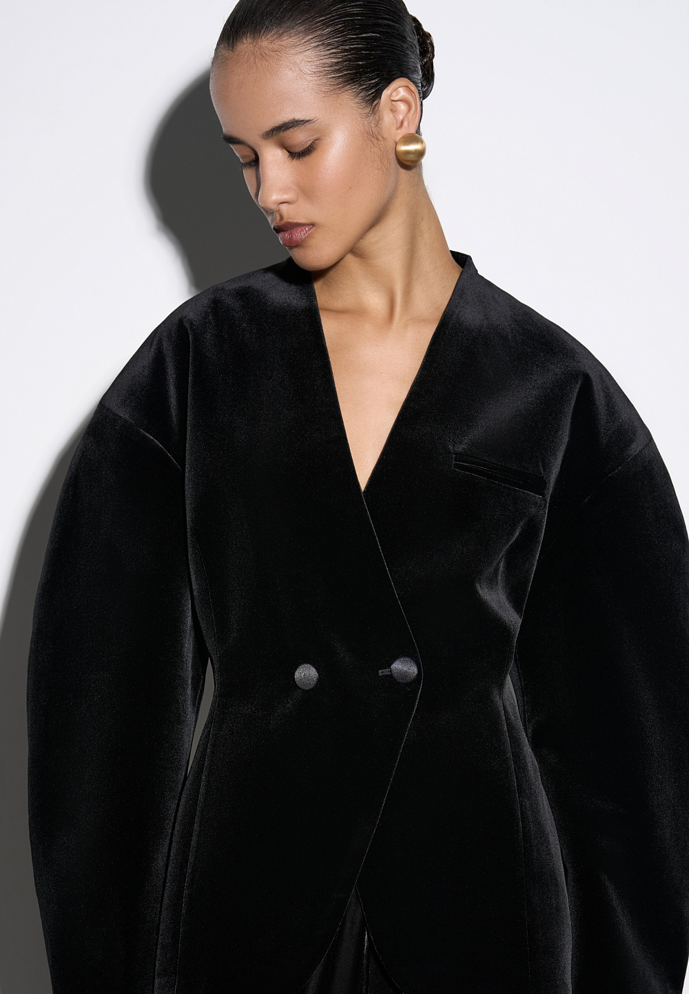 Velvet jacket with voluminous sleeves. The model has a fitted silhouette, with a chest pocket, and a low collar without lapels. Shoulders with shoulder pads. The product is lined.