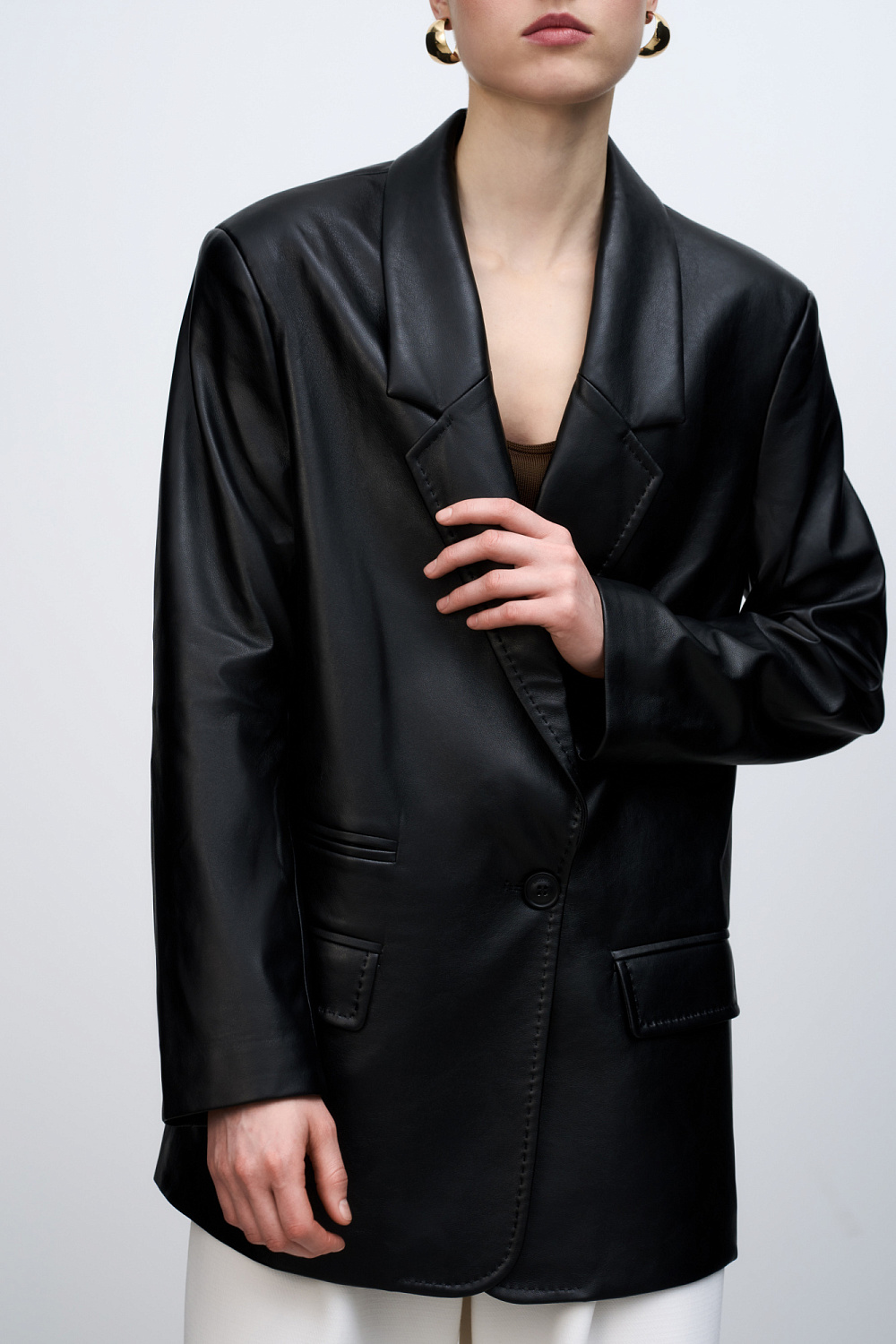 Oversized single-breasted blazer with faux pockets and button fastening. Made of faux-leather with 100% viscose lining.