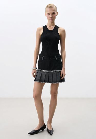 Short single-breasted jacket. Straight fit model with classic lapels. The bottom of the product is decorated with denim fabric with raw edges and belt loops. Metal button closure. Lined.