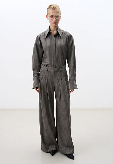 Single breasted striped jacket. Straight cut model with narrow lapels, chest pocket, side pockets with flaps and buttons on the sleeves. Fastening with hidden buttons under the placket. The product is lined.
