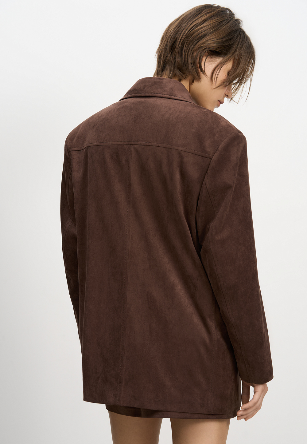 Single-breasted jacket made of fabric with an imitation of the appearance and properties of natural suede. Model with a classic turn-down collar and side pockets with flaps. Finished with tone-on-tone stitching. Three button closure. The product is lined.
