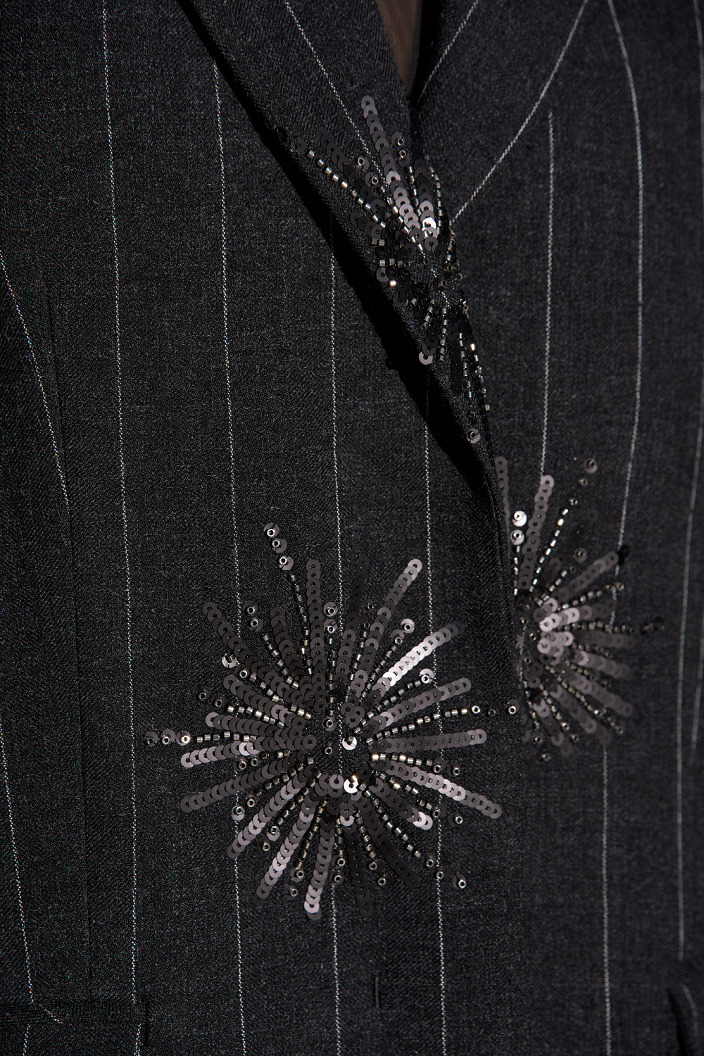 Single-breasted wool jacket, decorated with a sequin pattern. Straight fit model with narrow lapels, wide shoulders, side pockets with flaps and two button closure. The product is lined.