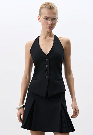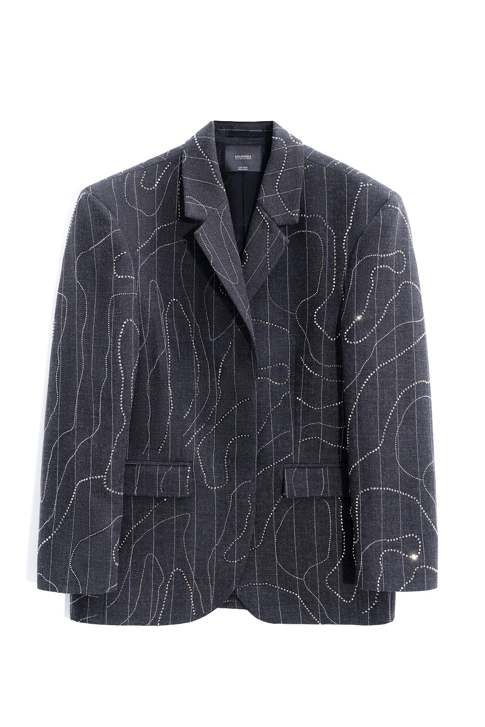 Single-breasted jacket made of wool, decorated with a rhinestone pattern. Straight fit model with narrow lapels, wide shoulders, side pockets with flaps and two button closure. The product is lined.