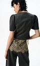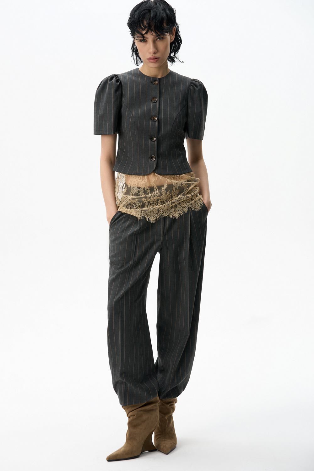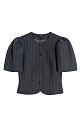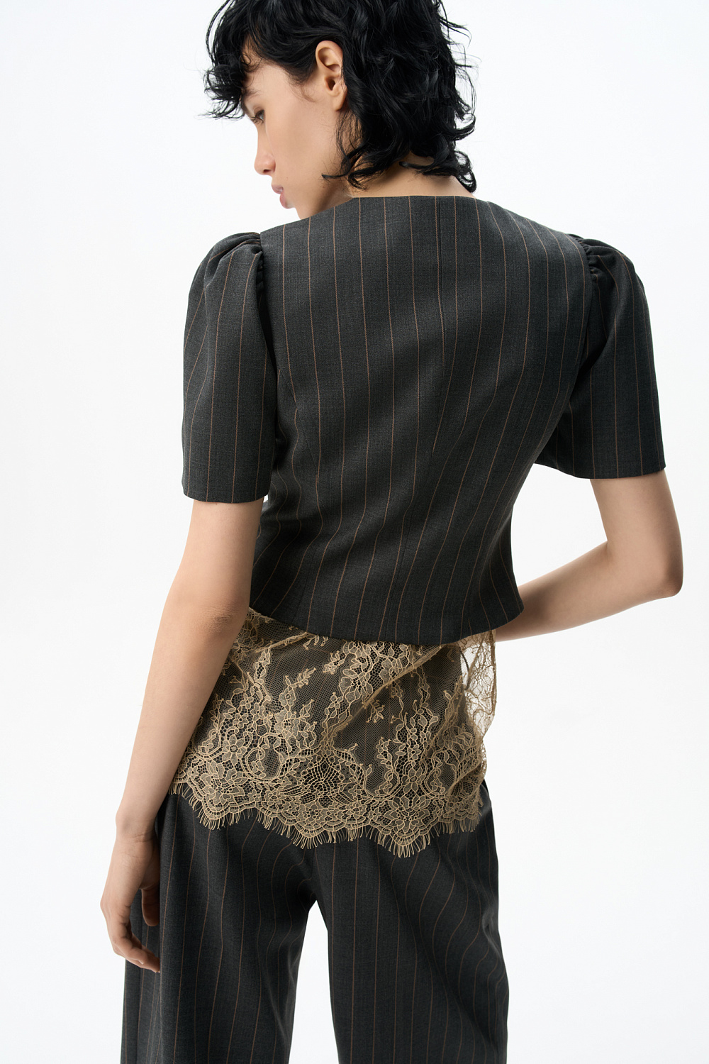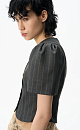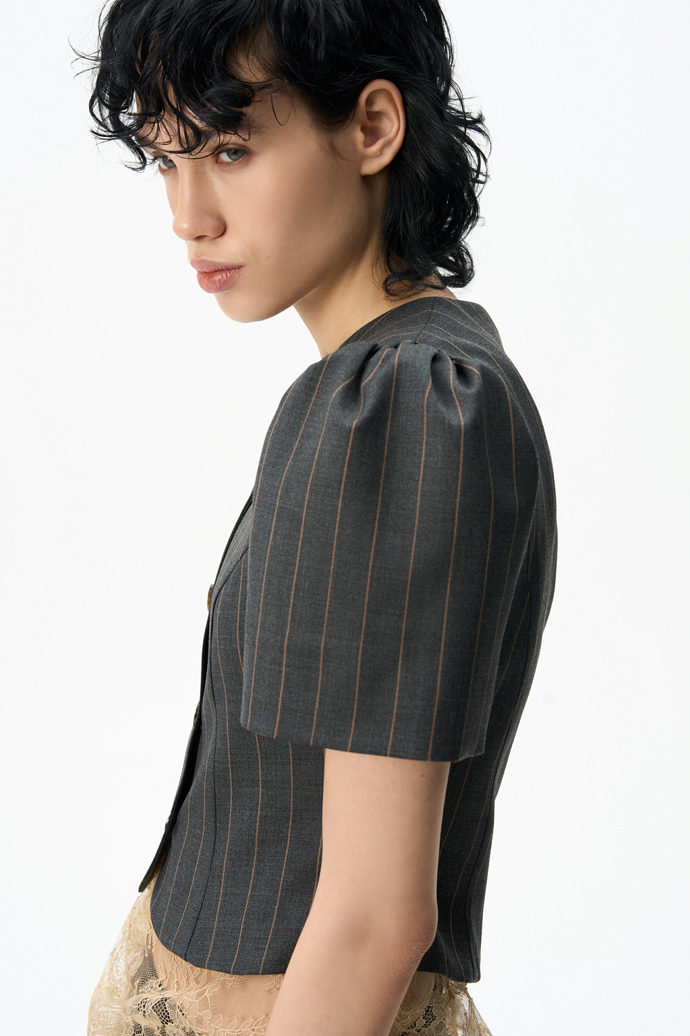 Single-breasted jacket without lapels. The model has a fitted silhouette with curved darts and short puffed sleeves. Button closure. The product is lined.