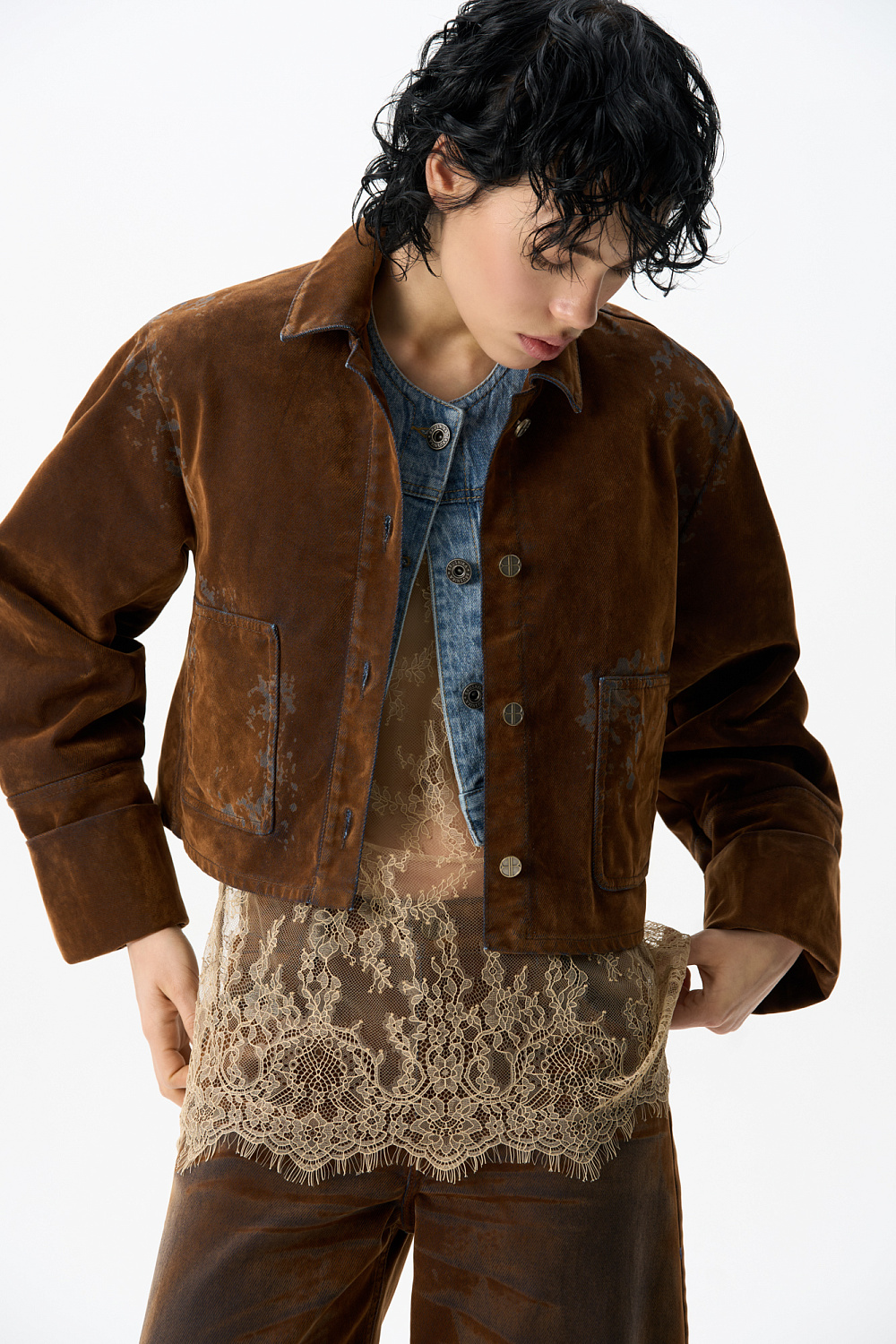 Cropped jacket made of flocked denim - cotton with an imitation velvet texture. Straight-cut model with a turn-down collar, patch pockets and decorative abrasions. Fastening with metal branded buttons.