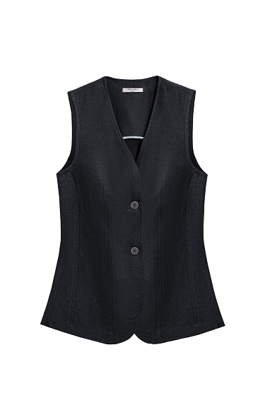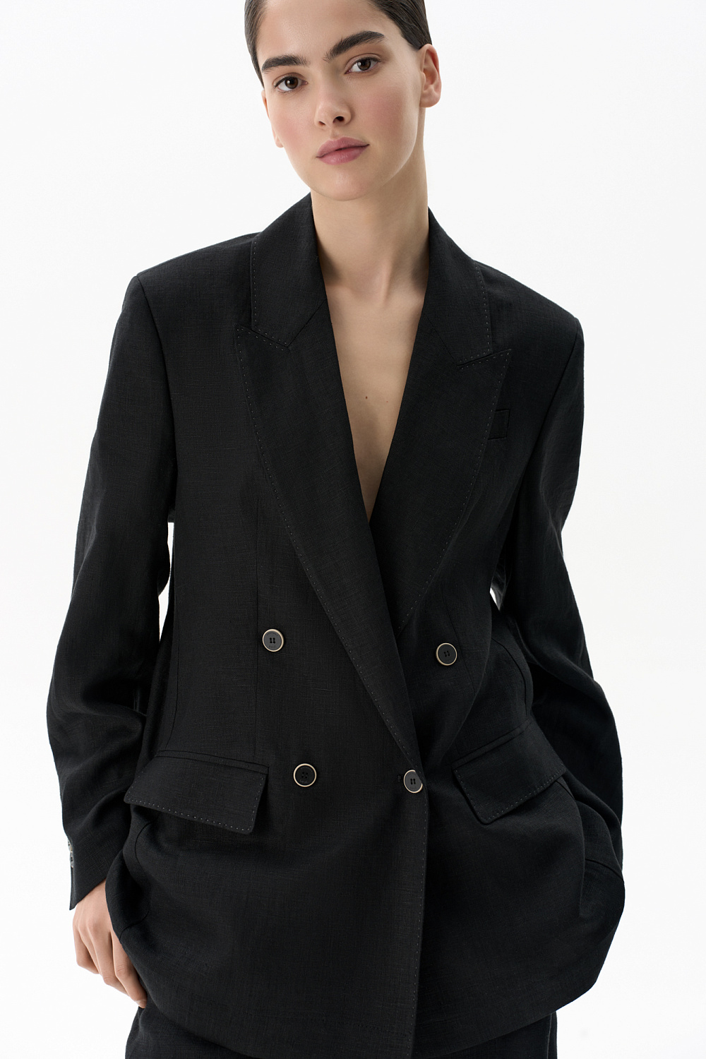 Double-breasted jacket with stitching made from 100% linen. Straight cut model with lapels. Two welt pockets with flaps and a chest pocket. The cuffs are decorated with buttons.
