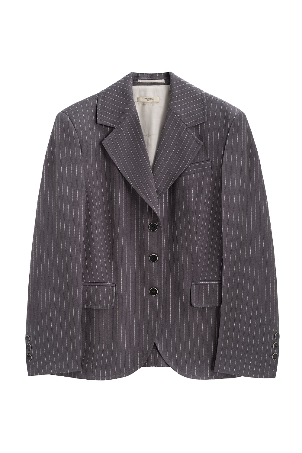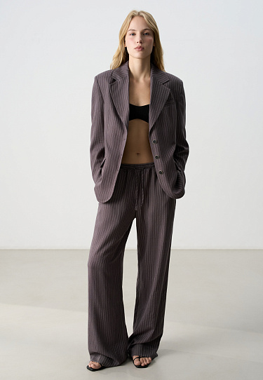 Classic striped jacket made of linen with the addition of viscose. The model has a straight silhouette, with an English turn-down collar, wide lapels and side pockets with flaps. Three button closure. The product is lined.